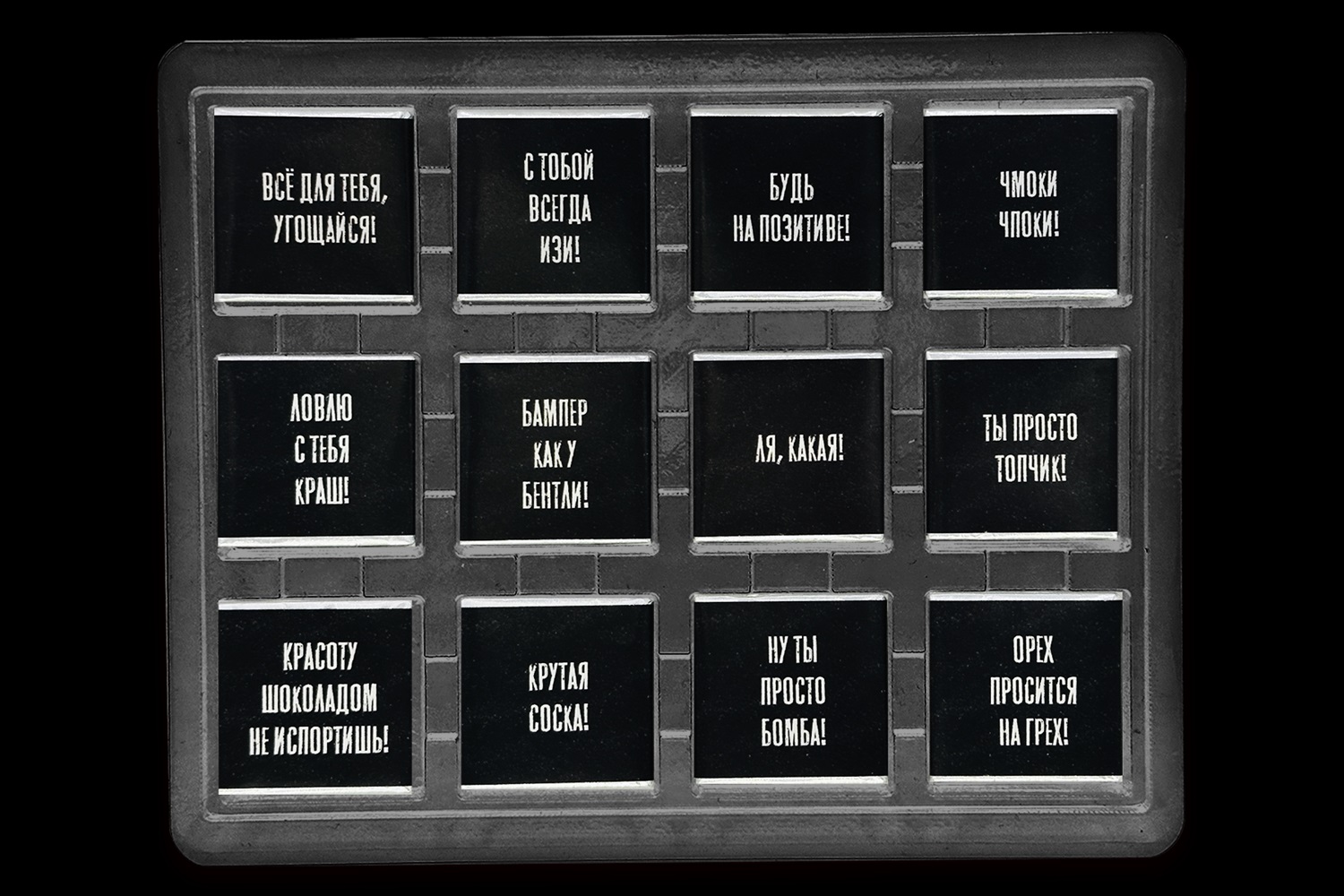 Наполнение: Внутри коробки 12 вкуснейших молочных плиток шоколада по 5гр. размером 31х31мм. Каждая завернута в индивидуальную упаковку под тематику набора. Состав- сахар, какао масло, сухое цельное молоко, какао тертое, эмульгатор соевый лецитин, натуральный ароматизатор ваниль.