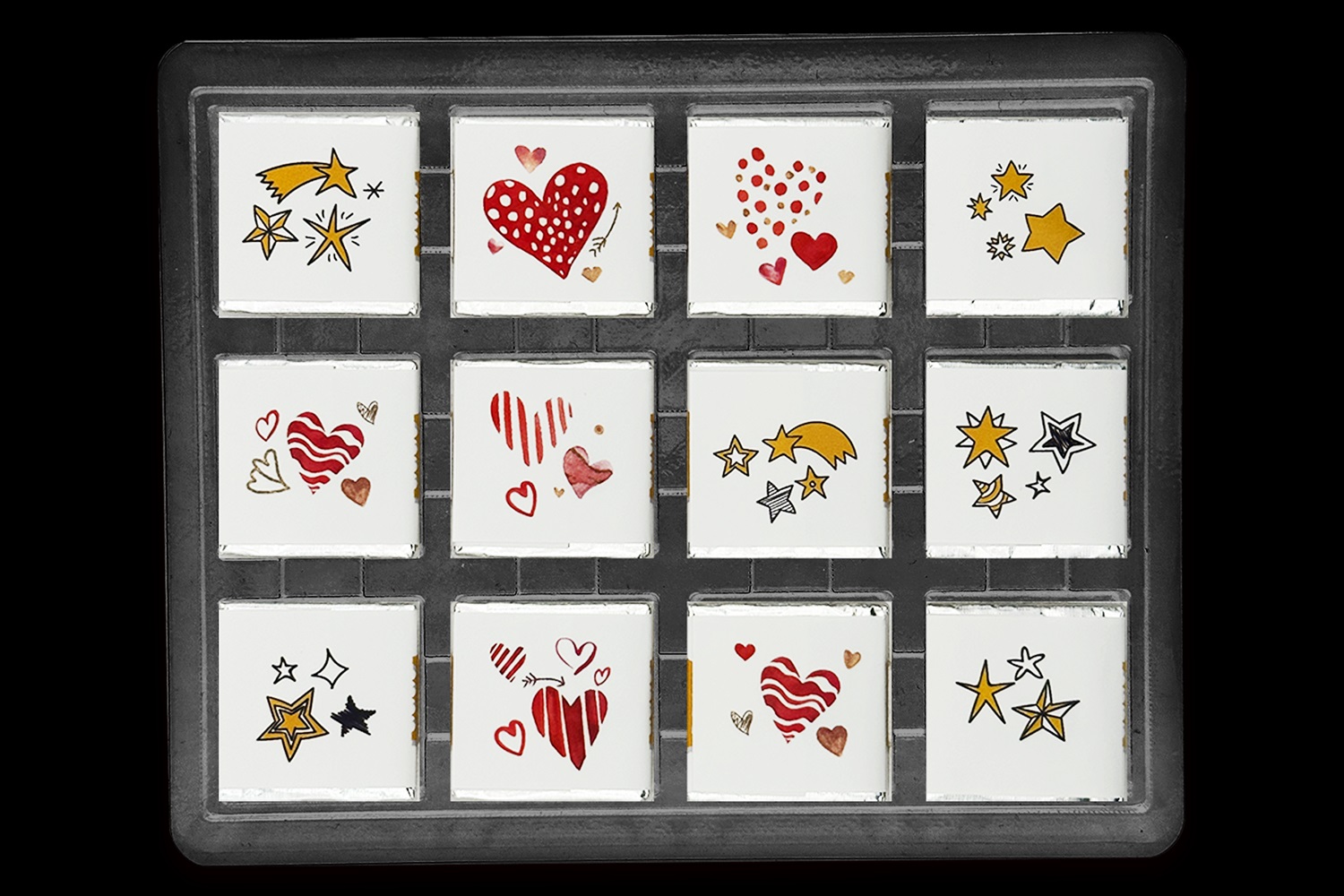 Внутри коробки 12 вкуснейших молочных плиток шоколада по 5гр. размером 31х31мм. Каждая завернута в индивидуальную упаковку под тематику набора. Состав: сахар, какао масло, сухое цельное молоко, какао тертое, эмульгатор соевый лецитин, натуральный ароматизатор ваниль.