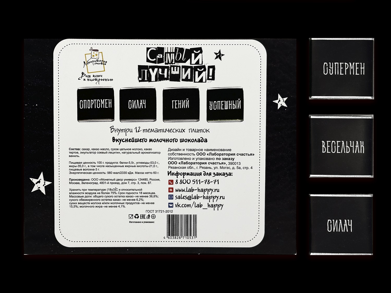 Наполнение: Внутри коробки 12 вкуснейших молочных плиток шоколада по 5гр. размером 31х31мм. Каждая завернута в индивидуальную упаковку под тематику набора. Состав- сахар, какао масло, сухое цельное молоко, какао тертое, эмульгатор соевый лецитин, натуральный ароматизатор ваниль.