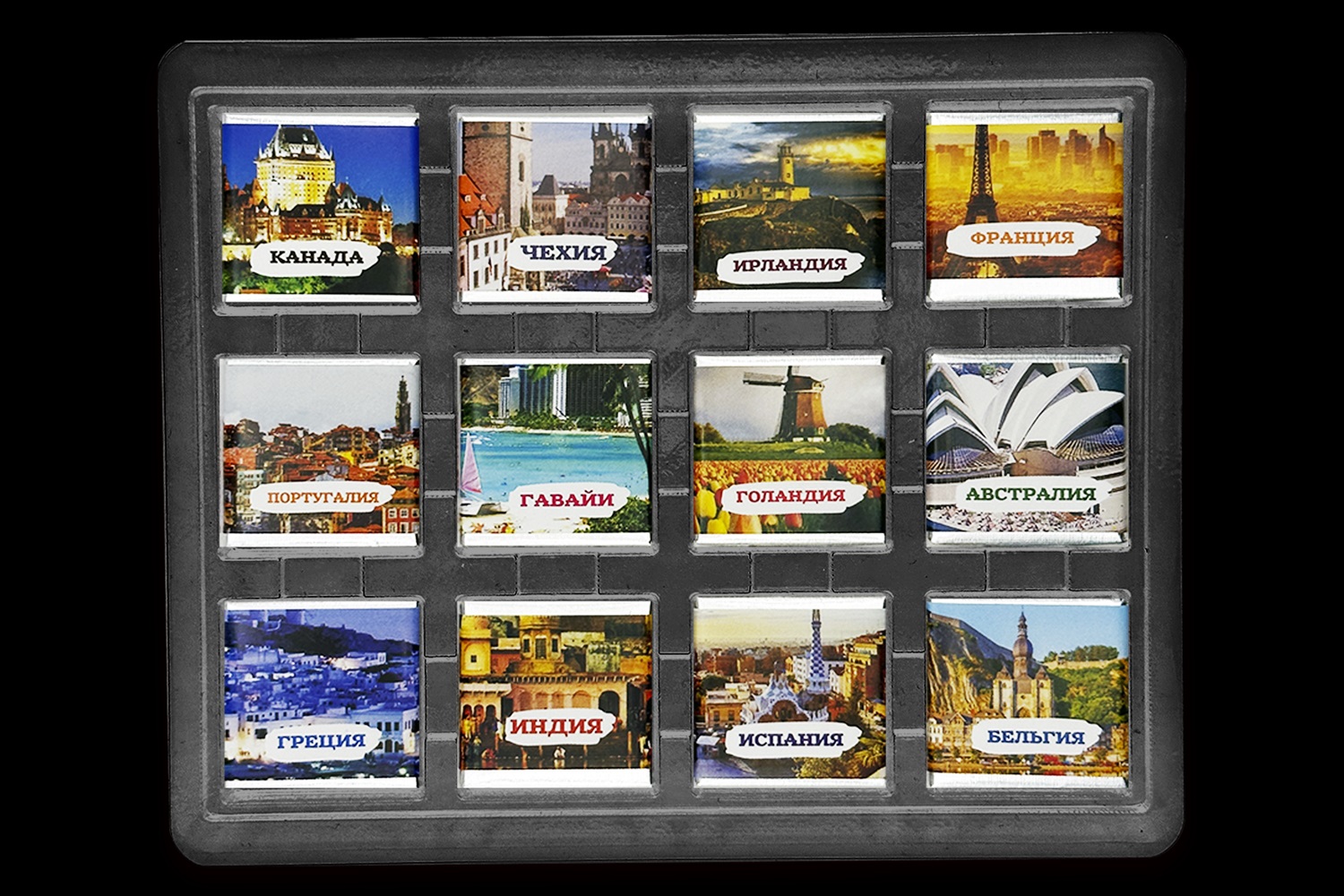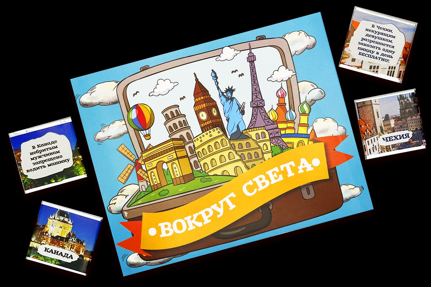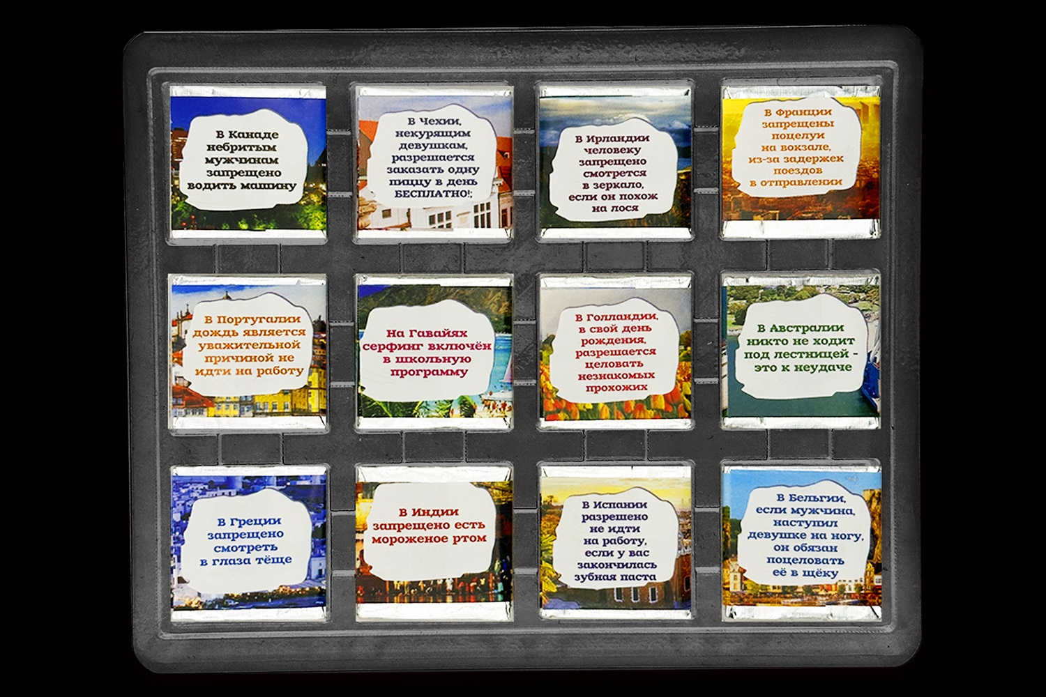 Внутри коробки 12 вкуснейших молочных плиток шоколада по 5гр. размером 31х31мм. Каждая завернута в индивидуальную упаковку под тематику набора. Состав: сахар, какао масло, сухое цельное молоко, какао тертое, эмульгатор соевый лецитин, натуральный ароматизатор ваниль.