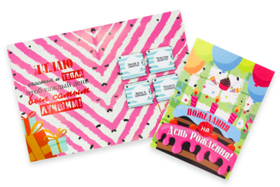 Наполнение: Внутри открытки 4 вкуснейшие молочные плитки шоколада по 5гр. размером 31х31мм. Каждая завернута в индивидуальную упаковку под тематику открытки. Состав- сахар, какао масло, сухое цельное молоко, какао тертое, эмульгатор соевый лецитин, натуральный ароматизатор ваниль.