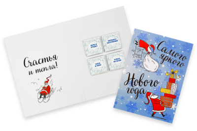 Наполнение: Внутри открытки 4 вкуснейшие молочные плитки шоколада по 5гр. размером 31х31мм. Каждая завернута в индивидуальную упаковку под тематику открытки. Состав- сахар, какао масло, сухое цельное молоко, какао тертое, эмульгатор соевый лецитин, натуральный ароматизатор ваниль.