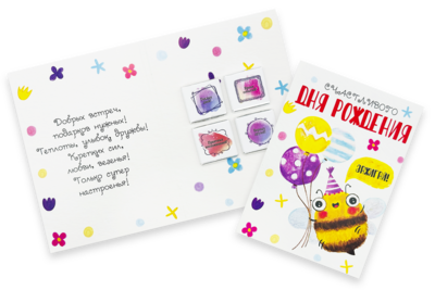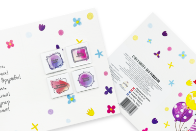 Наполнение: Внутри открытки 4 вкуснейшие молочные плитки шоколада по 5гр. размером 31х31мм. Каждая завернута в индивидуальную упаковку под тематику открытки. Состав- сахар, какао масло, сухое цельное молоко, какао тертое, эмульгатор соевый лецитин, натуральный ароматизатор ваниль.
