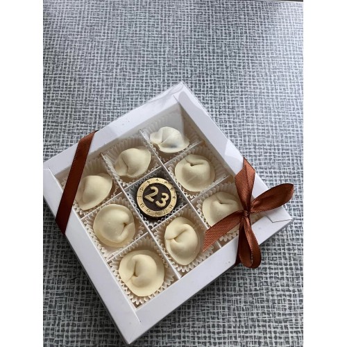 Слой белого шоколада отвечает за «тесто», а «фарш» миндаль — за начинку.