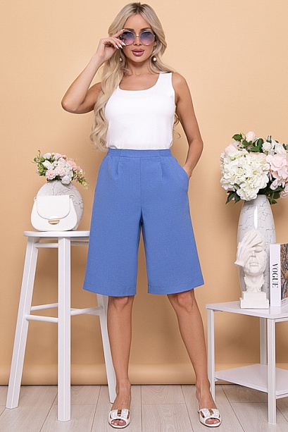 Шорты из легкой костюмной ткани без застежки,с имитацией гульфика по переду.По бокам функциональные карманы.Притачной пояс с эластичной резиной по бокам и спинке. 15% лен,80% п/э,5% лайкра Комментарии к товару