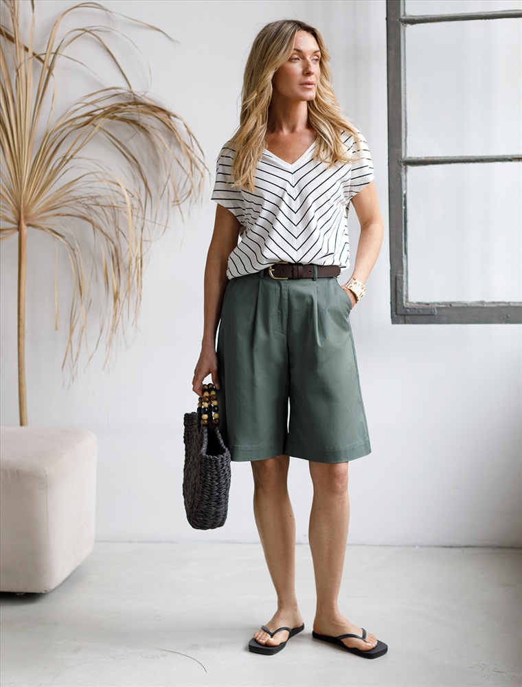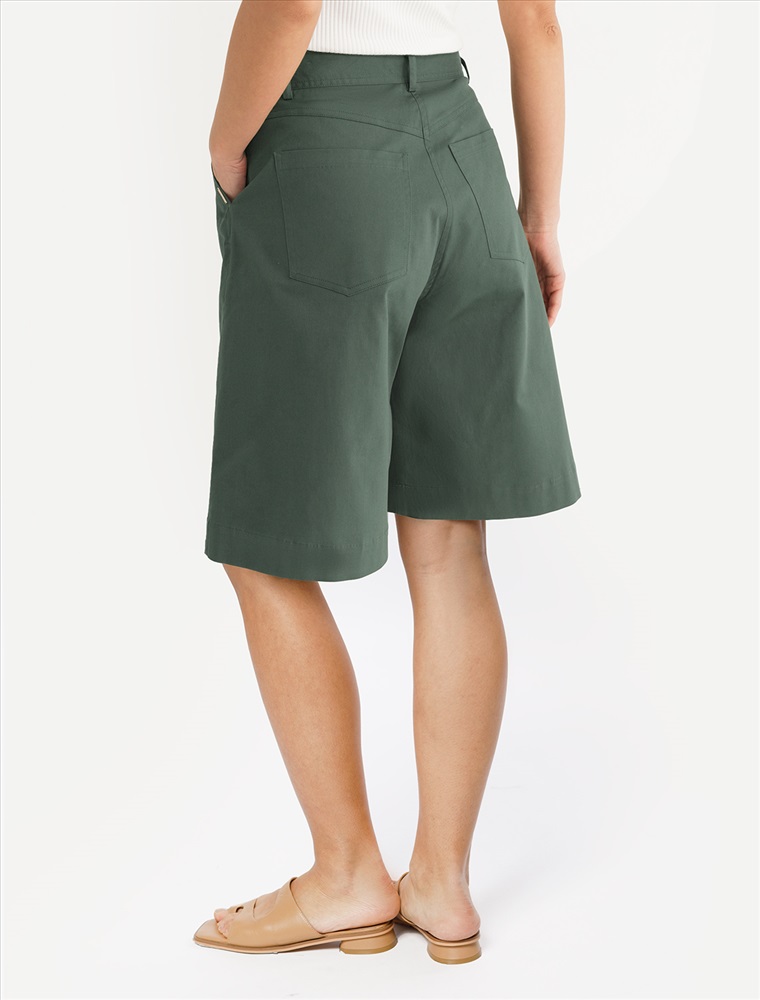 Шорты-бермуды с защипами выполнены из хлопкового твила. Длина по колено и свободный силуэт комфортны в носке, а универсальные оттенки впишутся в любой гардероб. Изделие дополнено застежкой на молнию и пуговицу, боковыми и задними карманами. Натуральный материал ткани обеспечивает высокий уровень комфорта, отличную гигроскопичность и воздухопроницаемость. Эластан в составе изделия минимизрует деформацию модели и продлевает срок носки.