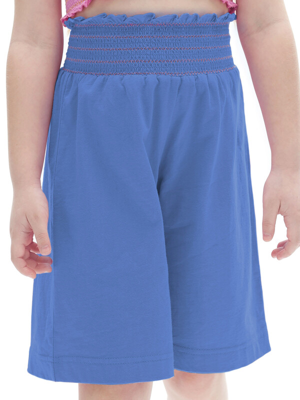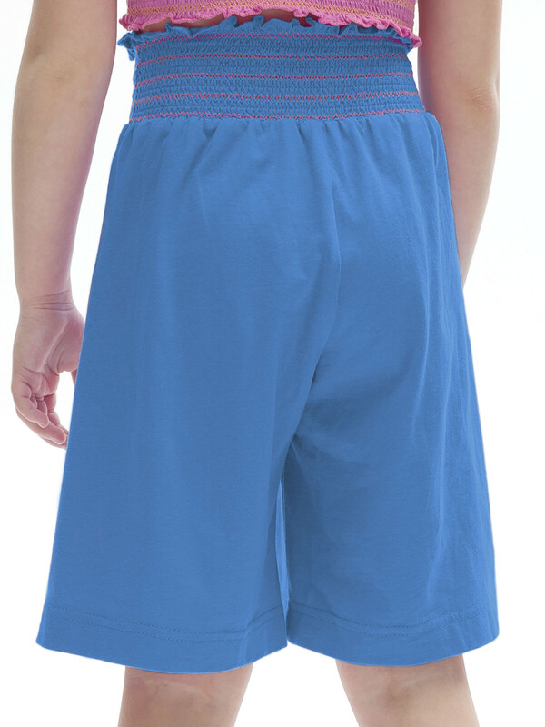 Шорты-бермуды из 100% хлопка для девочки. Натуральный состав ткани и свободный крой обеспечивают комфорт вашему ребёнку. Изделие приятное на ощупь и отлично подходит для жаркой погоды. Пояс модели украшает горизонтальная сборка контрастными нитками с деликатным рюшем вверху — актуальный летний тренд. Такие шорты будут носиться долго. Ребёнок растёт, и они словно "растут" вместе с ним. Однотонные яркие бермуды легко сочетать с топами и футболками различных силуэтов и расцветок.