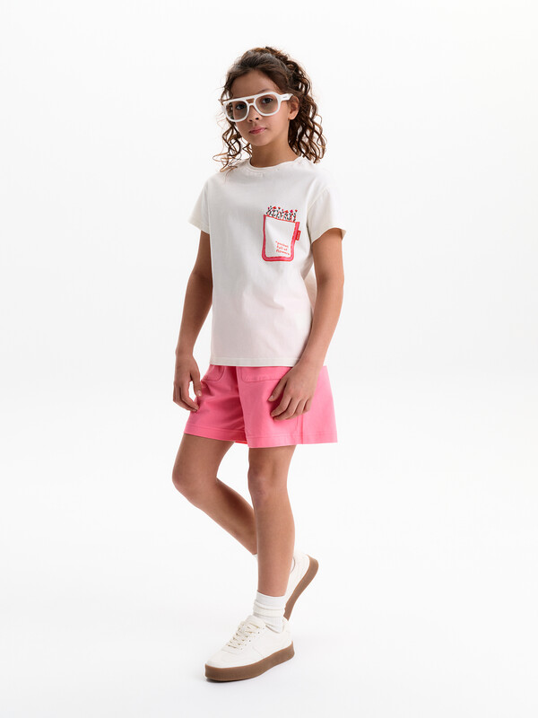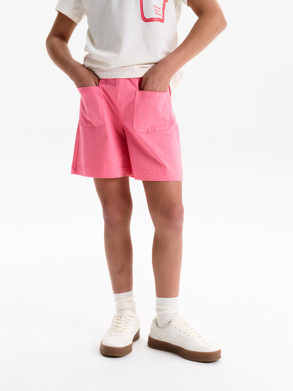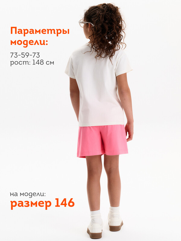 Шорты трикотажные для девочек из 100% хлопка. Длина уменьшена до середины бедра по сравнению с коллекцией Лето 25. Шорты с поясом на широком простроченном эластике и дополнительной шнуровкой обеспечивают идеальную посадку и регулировку по размеру.По переду два накладных кармана.