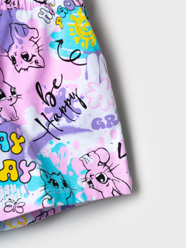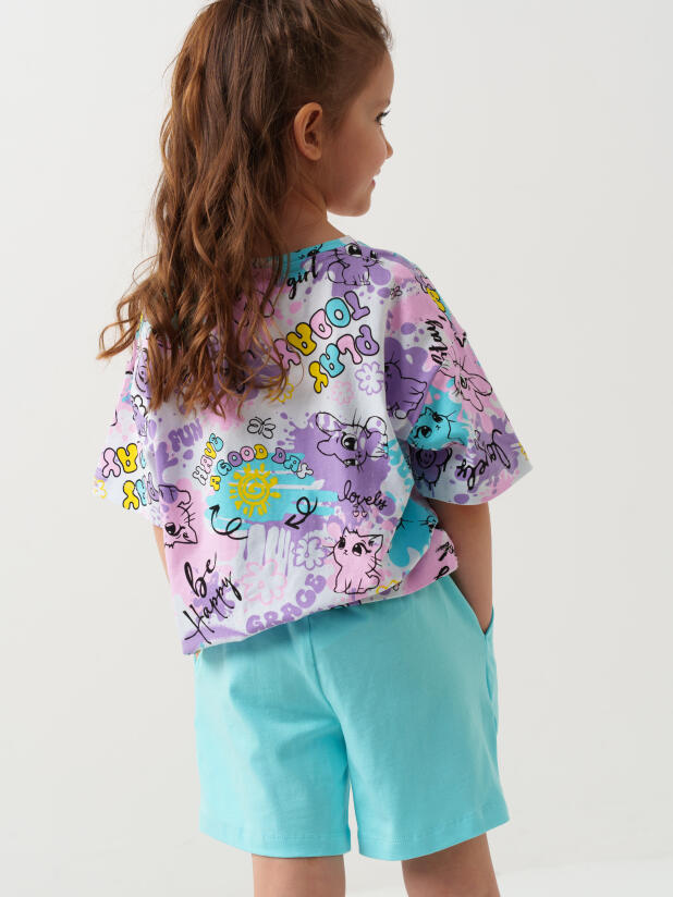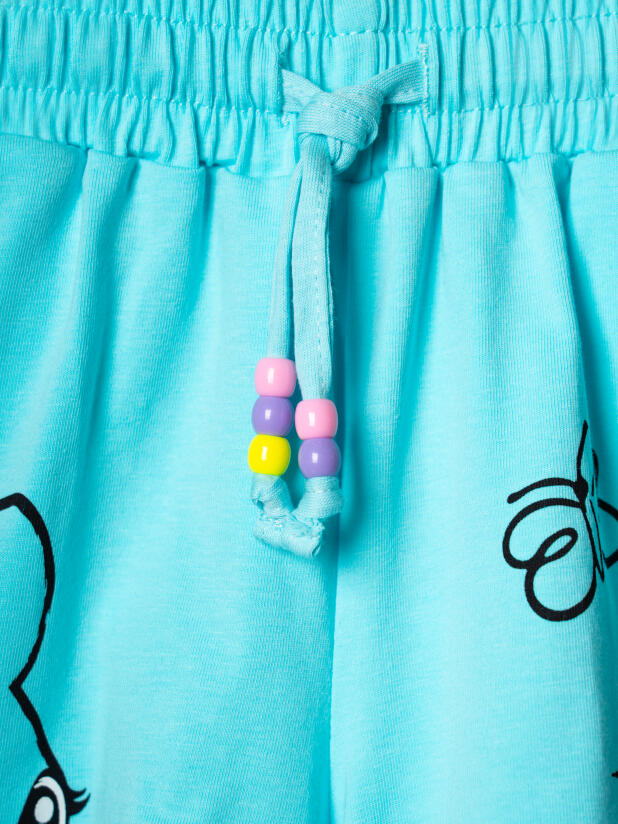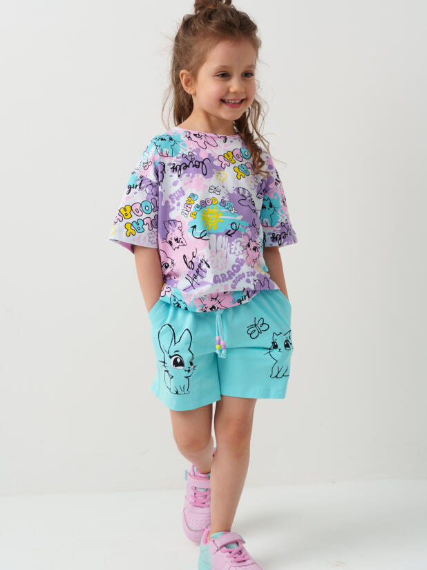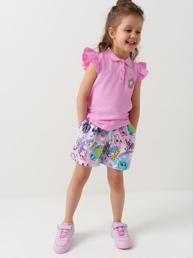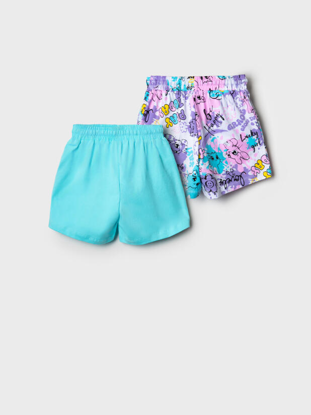 Набор детских шорт для девочки. В комплект входят две пары шорт свободного кроя. Модели из мягкого, хлопкового трикотажа джерси. Удобная посадка обеспечивается эластичным поясом со шнуром с бусинами. По бокам расположены два кармана.