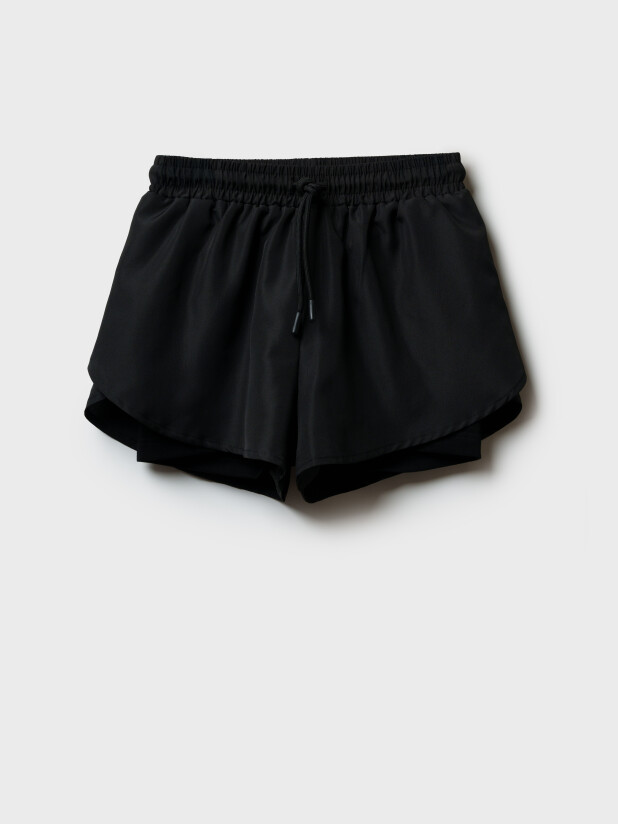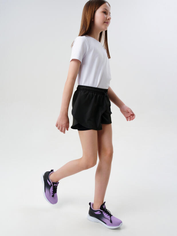 Универсальные спортивные трикотажные шорты для подростков оснащены внутренними базовыми черными шортами, что особенно удобно при занятиях гимнастикой, танцами или спортом. Широкий пояс со шнурком позволяет подогнать посадку под индивидуальные параметры ребёнка, а вместительные карманы делают модель практичной и универсальной.