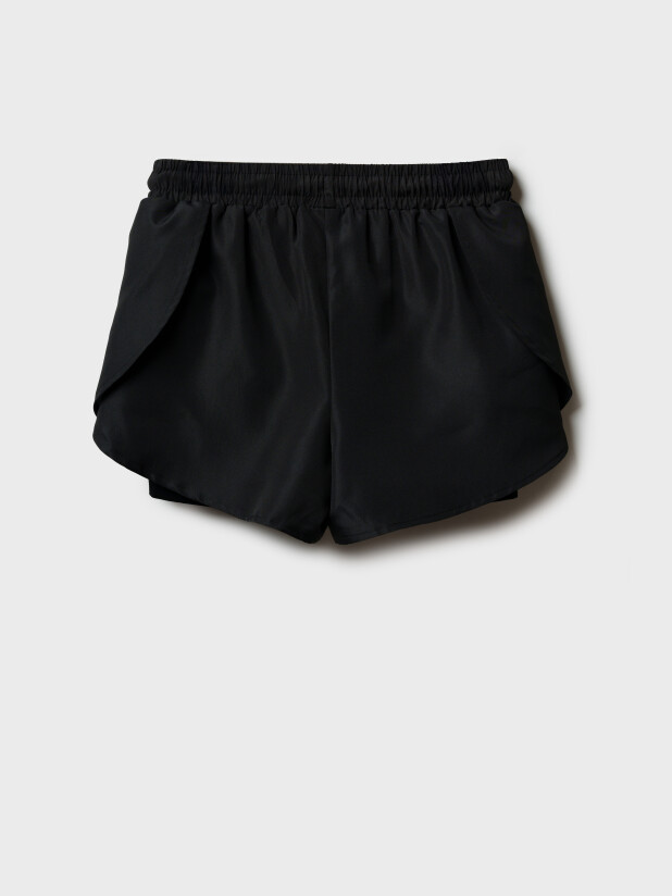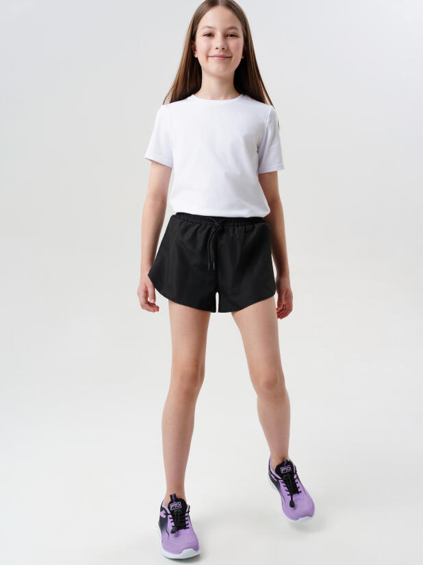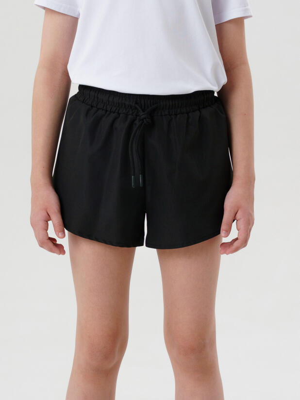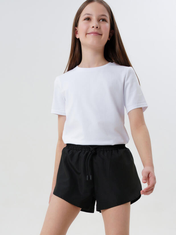 Эти чёрные подростковые шорты для девочек выполнены из лёгкого, прочного и приятного на ощупь трикотажа джерси. Благодаря прямому крою и мягкой посадке, они обеспечивают комфорт даже при активных движениях — будь то физкультура, подвижные игры во дворе или занятия спортом.