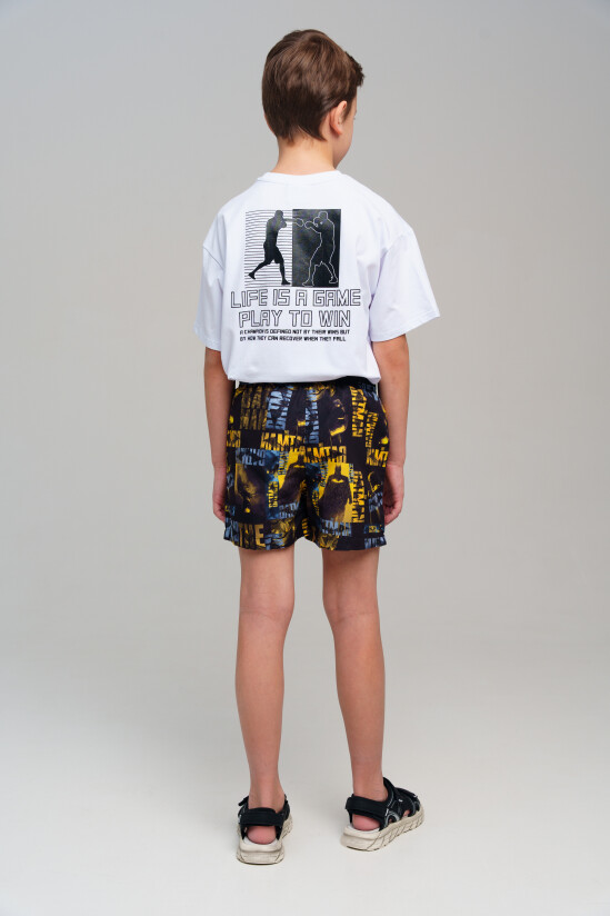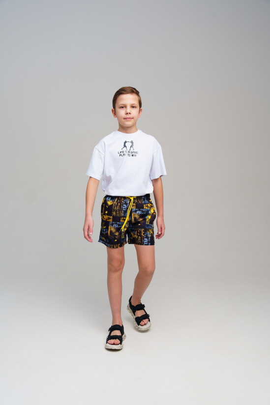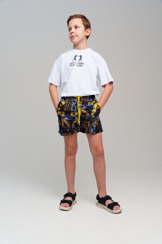 Плавательные шорты из быстросохнущего материала с водоотталкивающей пропиткой для мальчика подростка. Бордшорты для мальчика подростка (swimshort) средней длины. Модель с подкладкой из мягкой сетки в виде трусов, карманы из сетки. Пояс на резинке с дополнительной регулировкой по талии шнурком. Благодаря UF-защите, ткань сохраняет первоначальный вид даже при длительном пребывании на солнце.