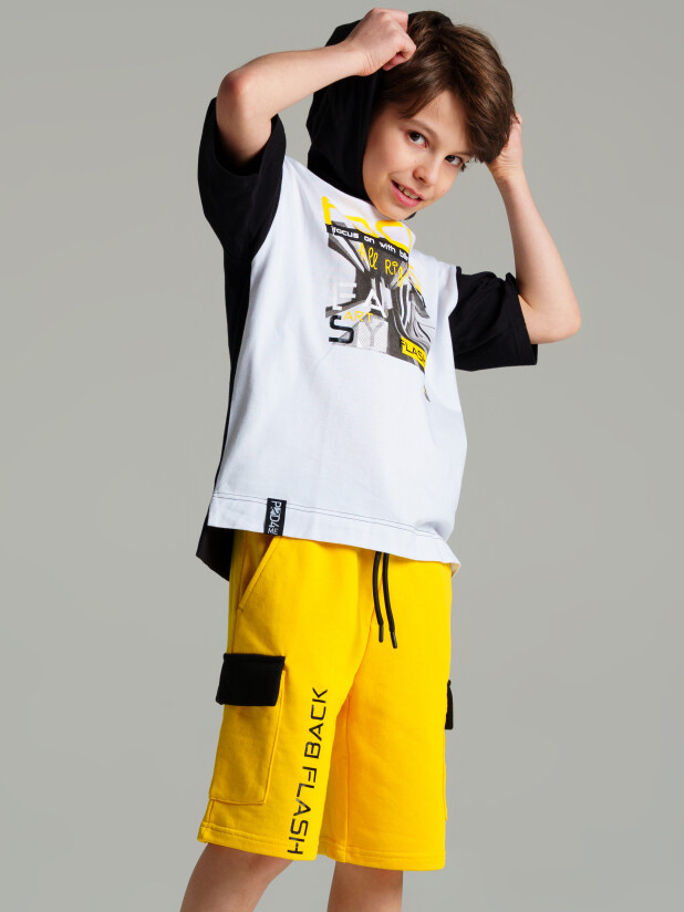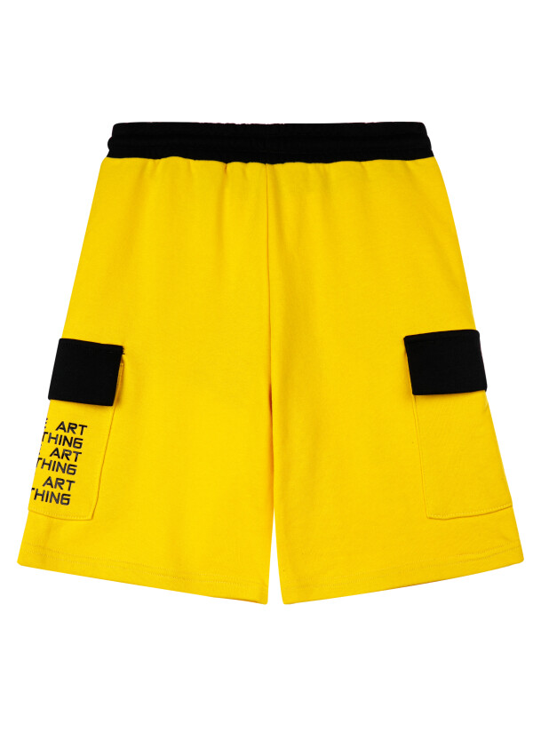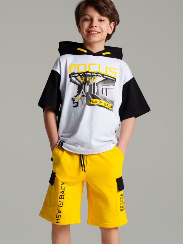 Шорты для мальчика из French Terry. Модель дополнена регулируемым поясом со шнурком. Боковые накладные карманы с клапанами.