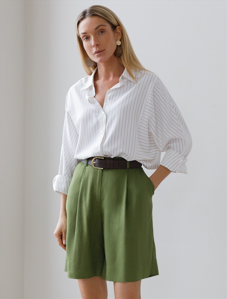 Состав: 70%Вис 30%Лен Шорты-бермуды выполнены изо льна с вискозой. Свободная модель с посадкой на талии. Ткань изящно струится, почти не мнется и сохраняет форму в течении долгого времени, обладает высокой воздухопроницаемостью. Идеальное решение в жаркий период. Подходит для любой фигуры и скрывает недостатки. Сочетается в костюме с топом D23.060 и блузками D29.237, D29.244