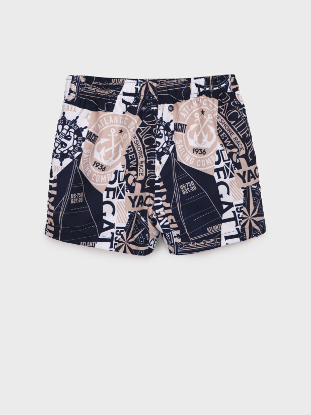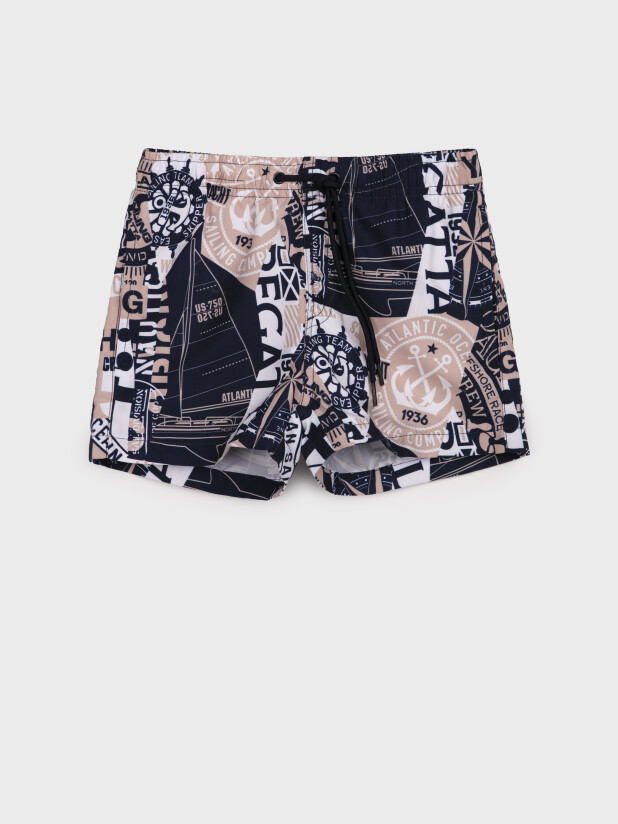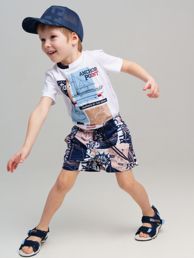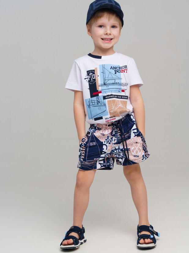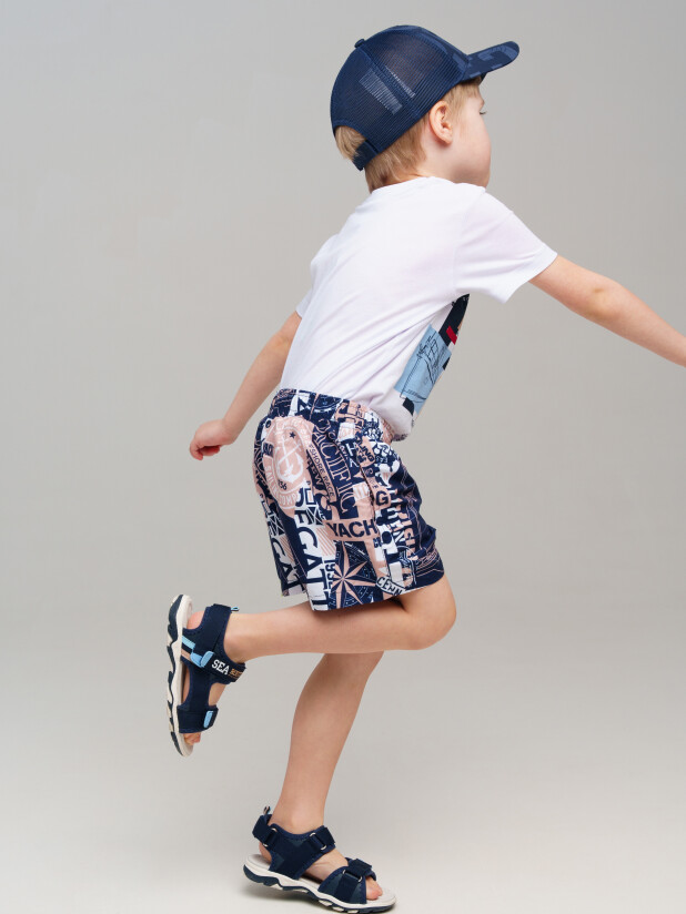 Плавательные шорты из быстросохнущего материала с водоотталкивающей пропиткой для мальчика. Бордшорты детские (swimshort) средней длины. Модель с подкладкой из мягкой сетки в виде трусов, карманы из сетки. Пояс на резинке с дополнительной регулировкой по талии шнурком. Благодаря UF-защите, ткань сохраняет первоначальный вид даже при длительном пребывании на солнце.