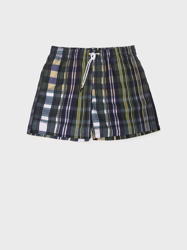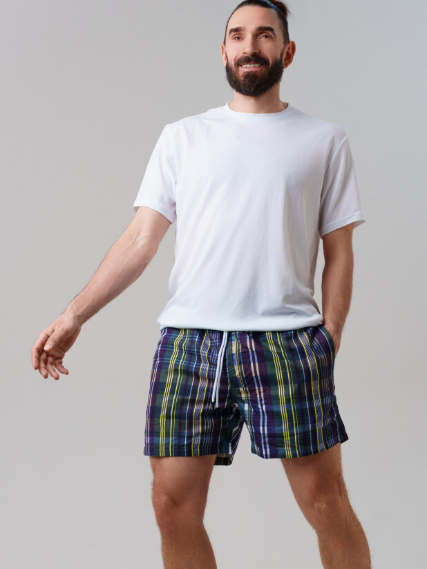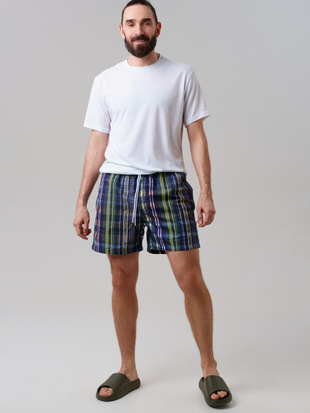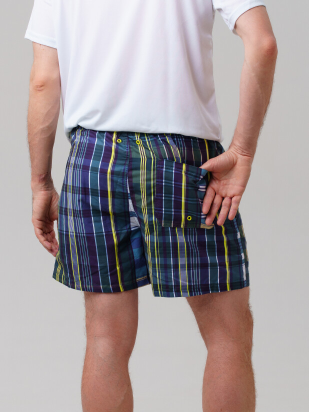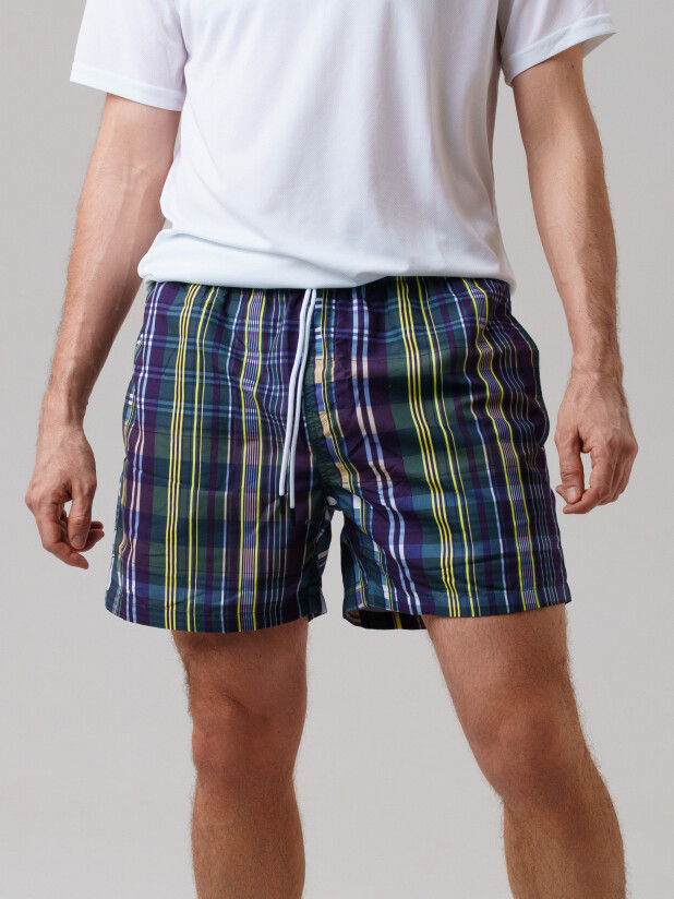 Мужские плавательные шорты из быстросохнущего материала с водоотталкивающей пропиткой. Бордшорты (swimshort) средней длины. Модель с подкладкой из мягкой сетки в виде трусов, карманы из сетки. Пояс на резинке с дополнительной регулировкой по талии шнурком. Благодаря UF-защите, ткань сохраняет первоначальный вид даже при длительном пребывании на солнце.