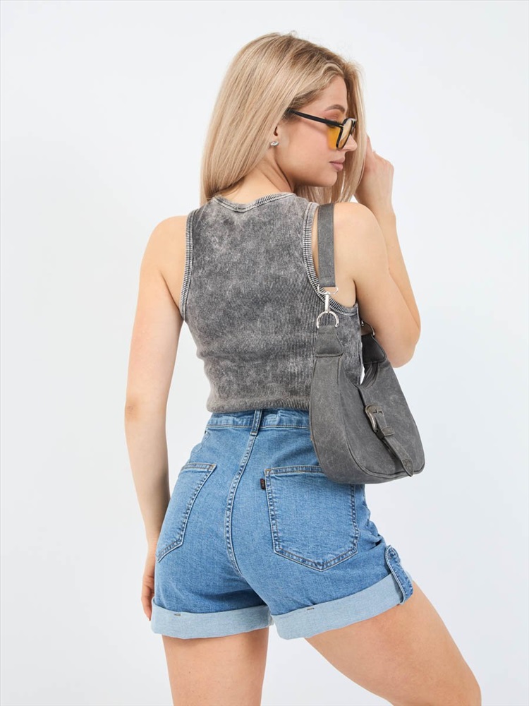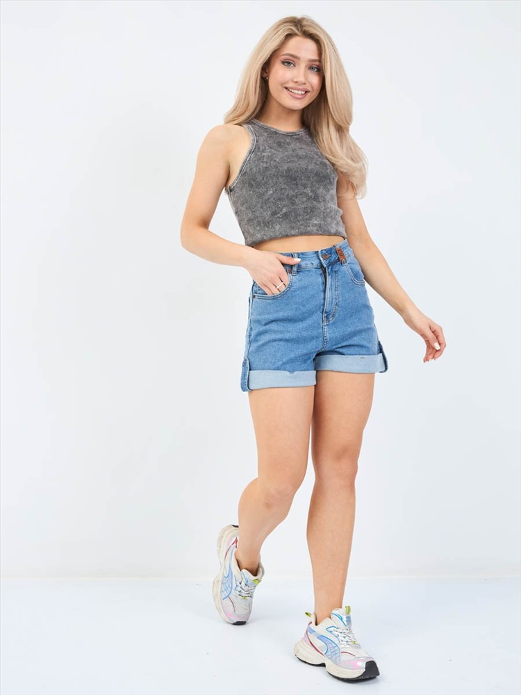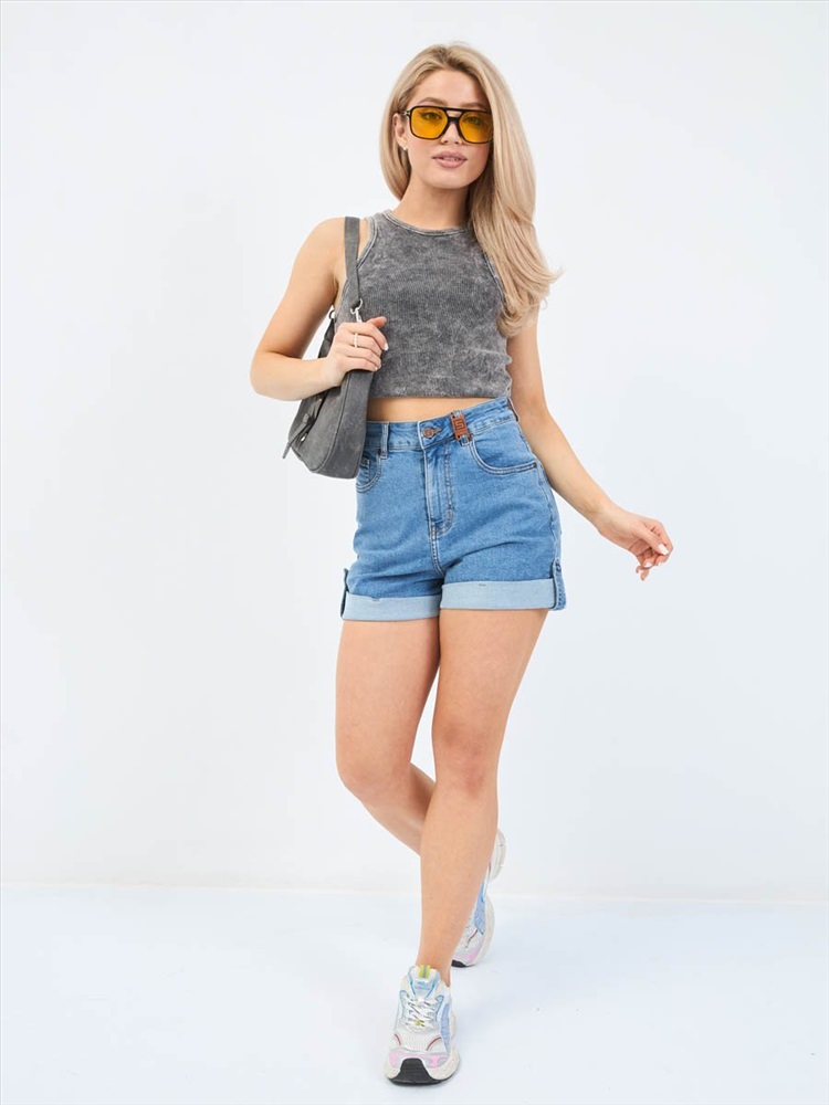 Женские шорты с пятью карманами. Посадка Comfort fit (свободные по бедру), высокая талия спереди и сзади. Для улучшения посадки сзади сделаны две вытачки. Застежка на молнии. Низ шорт подогнут изнаночной стороной ткани " на лицо". Выполнены из слабоэластичной ткани denim comfort stretch. Классическая средняя машинная стирка с камнями (stone wash).