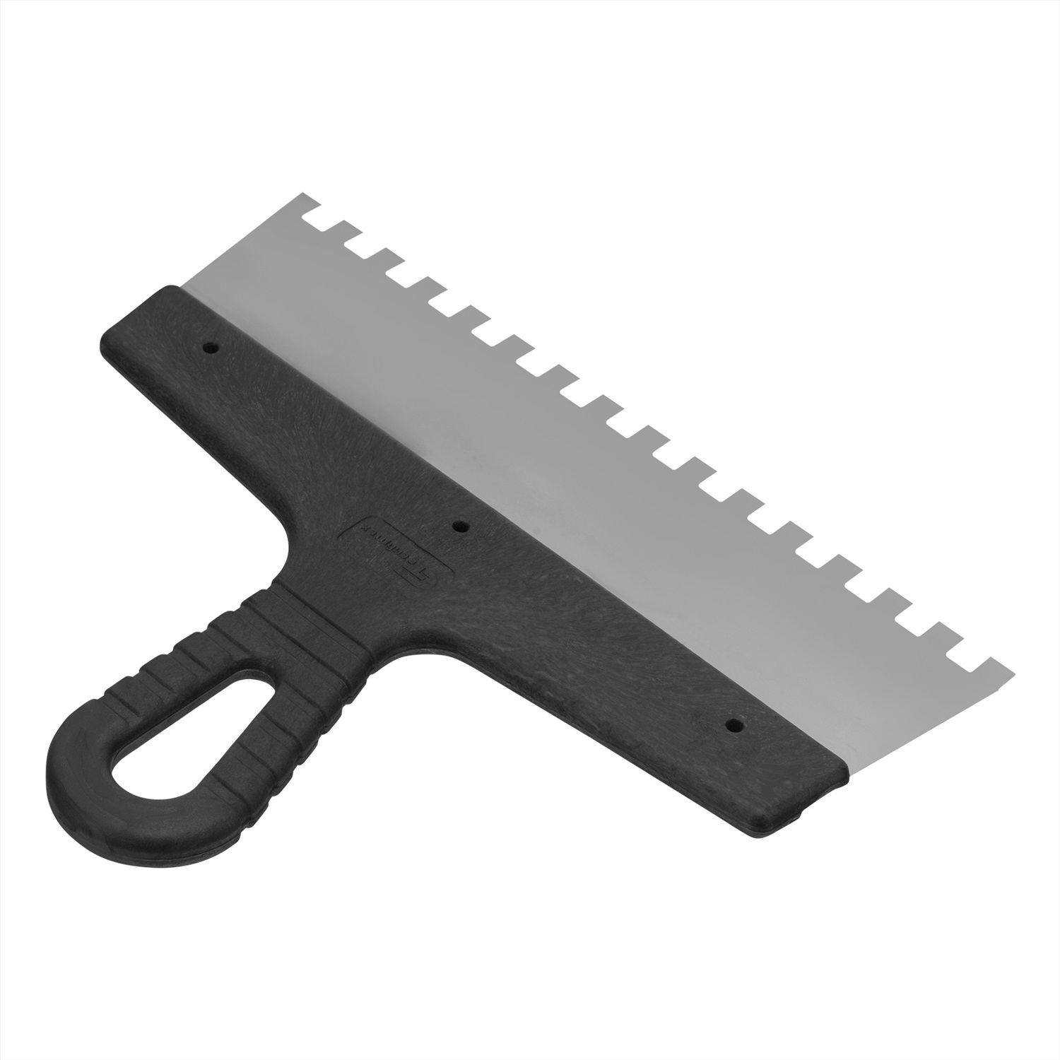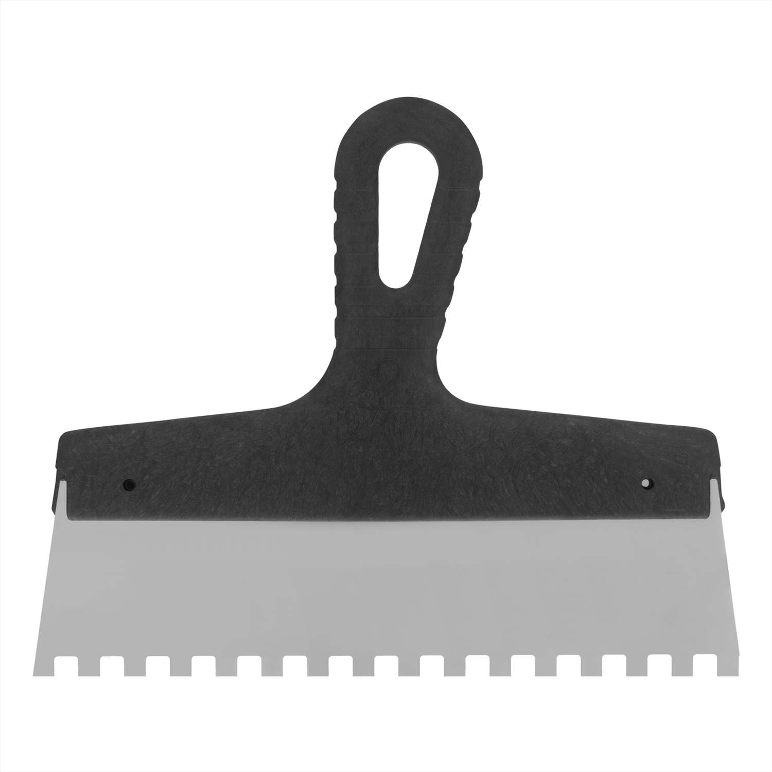 Шпатель Сибртех 85474 из нержавеющей стали, шириной 250 мм, с пластмассовой рукояткой и зубьями 8 х 8 мм, применяется во время проведения работ по укладке плитки, мозаики и т. д. Квадратные зубья облегчают нанесение клеевого состава, позволяя равномерно распределять его по поверхности. Зубья размером 8 х 8 мм рассчитаны на плитку площадью 400-900 см2.