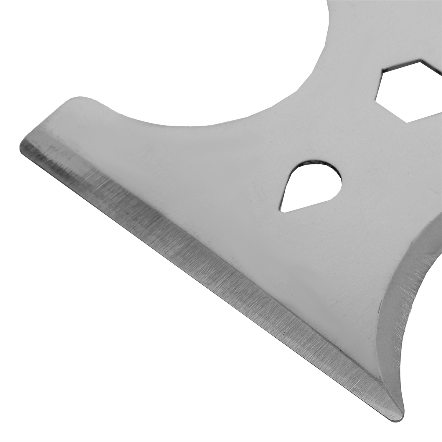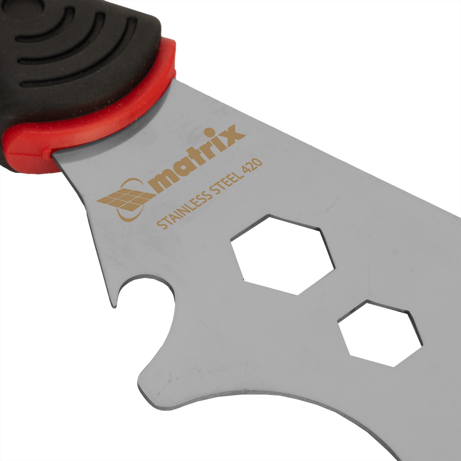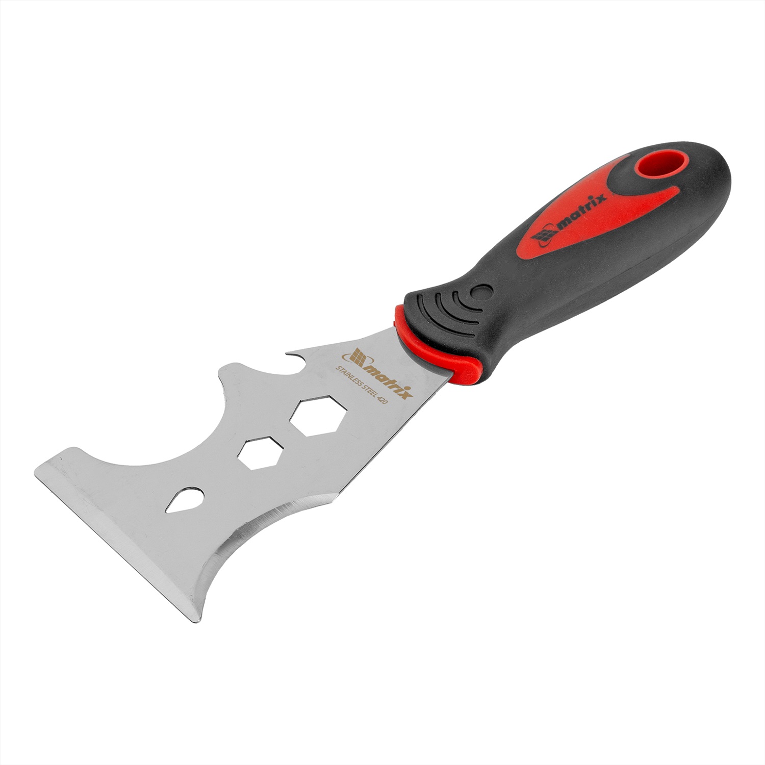 Многофункциональный шпатель-скребок Matrix 85558 9 в 1 с двухкомпонентной рукояткой имеет лезвие сложной конфигурации из нержавеющей стали. Используется для очищения поверхностей от шпатлевки, остатков цемента, зачистки труб и т. д. На жестком полированном полотне с лезвием шириной 75 мм предусмотрены выемки различной формы, благодаря которым инструмент можно использовать в качестве ключа на 11 и 15 мм, а также применять для очистки валиков, извлечения гвоздей, поддевания предметов, открывания банок с краской, равномерного нанесения смесей и выполнения прочих работ. Преимущества