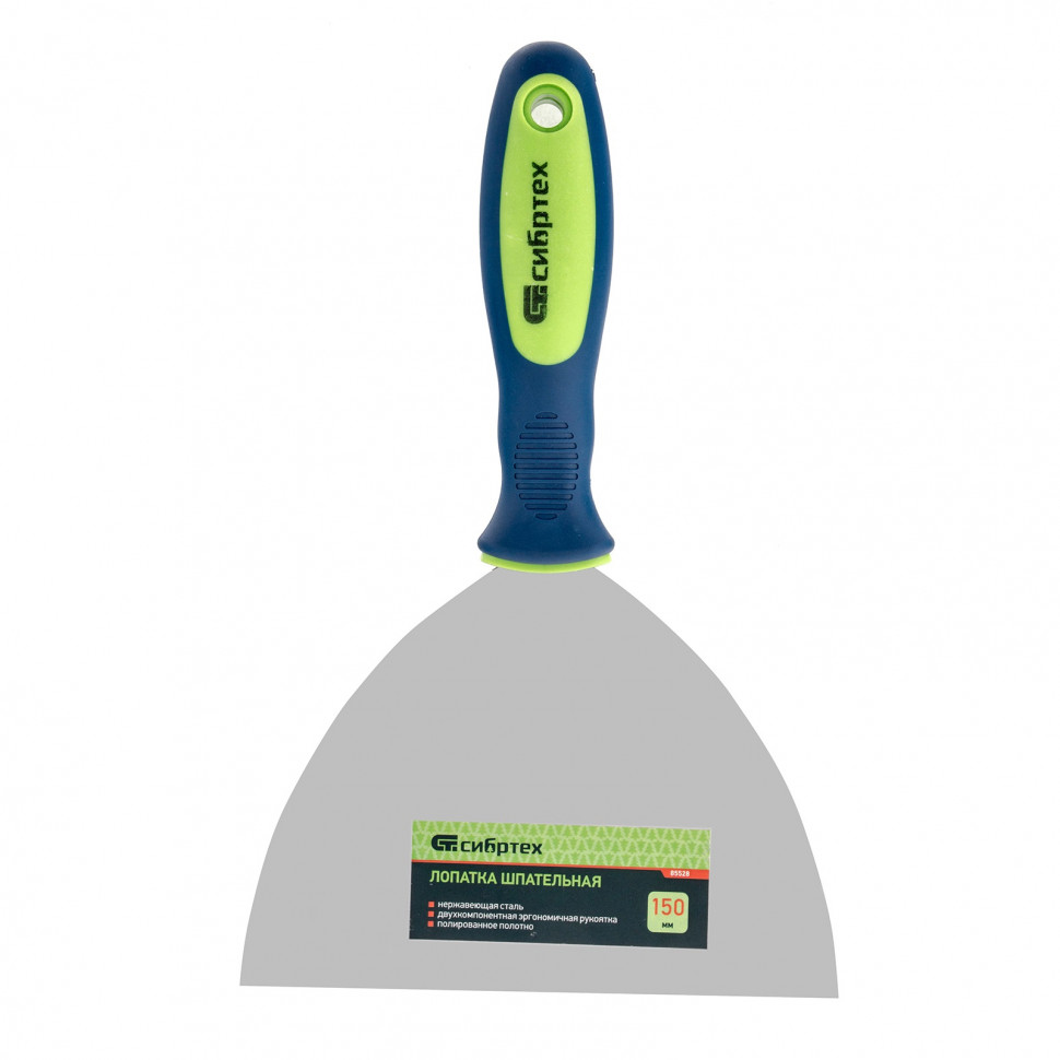 Шпательная лопатка из нержавеющей стали Сибртех 85528 шириной 150 мм, с двухкомпонентной рукояткой, облегчает проведение ремонтно-отделочных работ. Позволяет наносить и разравнивать строительные смеси, шпаклевать швы, заполнять трещины и удалять старые обои.
