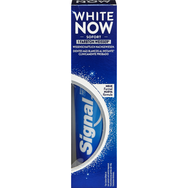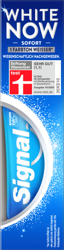 Sofort weißere Zähne* nach nur einer Anwendung: Signal Zahncreme White Now funktioniert mit blauem Schaum, der wie ein optischer Filter wirkt. Dadurch wird der Gelbstich der Zähne gemindert. Gleichzeitig helfen spezielle Inhaltsstoffe, das natürliche Weiß der Zähne sanft zurückzugewinnen. Eine Zahnpasta für jeden Tag, mit Kariessschutz und gletscherfrischem Geschmack für ein angenehm frisches Mundgefühl. *Der Sofort-Effekt ist rein optisch und zeitlich begrenzt.