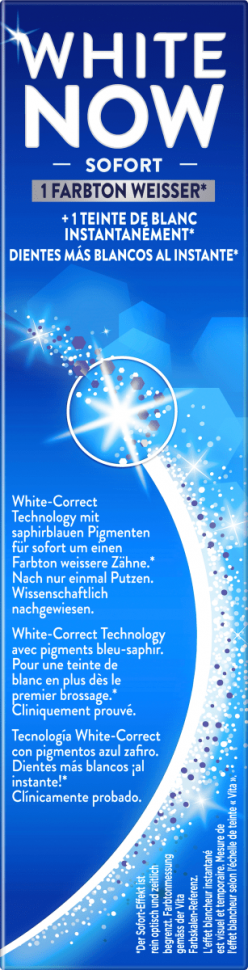 Зубная паста White Now работает с синей пеной, которая действует как оптический фильтр, который уменьшит желтый оттенок зубов. В то же время специальные ингредиенты помогают мягко восстановить естественную белизну зубов. Зубная паста на каждый день, с защитой от кариеса и ледниковым свежим вкусом для приятного ощущения свежести во рту. Мгновенный эффект является визуальным и ограничен по времени.