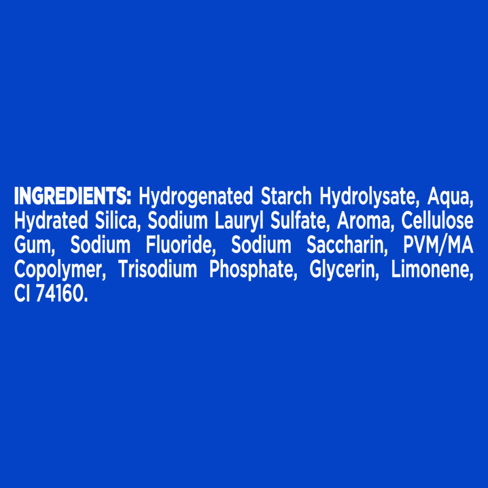 Inhaltsstoffe Sorbitol, Aqua, Hydrated Silica, PEG-32, Sodium Lauryl Sulfate, Parfum, Cellulose Gum, Sodium Fluoride, Sodium Saccharin, PVM/MA Copolymer, Trisodium phosphate , Mica, Glycerin, Lecithin, Limonene, CI 74160, CI 77891
