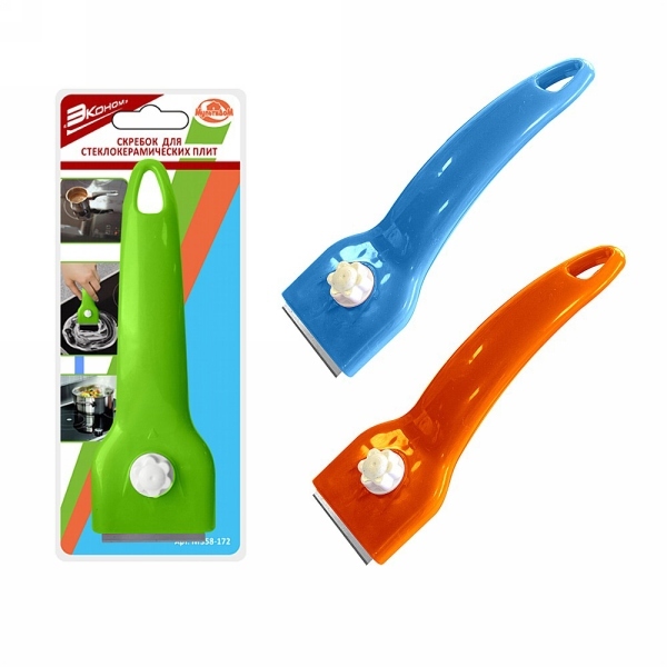 Скребок предназначен для чистки стеклокерамических, стеклянных и кафельных поверхностей от засохших и пригоревших остатков пищи. Лезвие скребка выдвигается и закрепляется при помощи гайки-фиксатора. Двухстороннее сменное лезвие снабжено специальным устройством-предохранителем, что обеспечивает безопасность во время использования изделия и его хранения. Использование скребка позволяет сберечь силы и время при уходе за стеклокерамической поверхностью плиты и продлевает срок ее службы. На нашем сайте можно купить скребки для стеклокерамических плит оптом, на самых выгодных условиях.