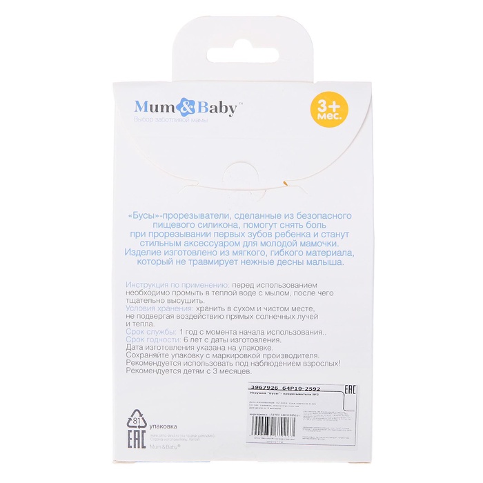 Производитель: Mum&Baby; Габариты: 19 x 11 x 3; Страна: Китай; В боксе: 100 шт; Состав: Пластик, силикон, текстиль; Материалы: пластик, силикон, текстиль; Фасовка: по 1 шт; Индивидуальная упаковка: Блистер; Габариты товара: 11 см × 3 см × 16 см; Сертификат: ЕАС; Набор: Нет; Цвет: Бирюзовый, Белый; Для кого: Унисекс; Длина, см: 36; Возраст: От 3 месяцев; В наборе, шт.: 1; Охлаждающий: Нет; Вид упаковки: Пакет; Рисунок: Нет; Адресат: Малышу/Малышке/Новорождённому; Материал: Силикон, Пластик, Полиэстер; Антиколиковая система: Нет; С держателем: Нет; Возраст: Для детей; Фиксированная цена: Да Прорезыватель для зубов и дёсен — незаменимый помощник при режущихся зубках! Форма ручки и размеры разработаны специально для детской ладони, поэтому малышу будет удобно её держать. Рельефная структура на поверхности изделия и его дополнительных элементов будет способствовать развитию мелкой моторики, а яркие цвета — формированию визуального восприятия мира. Товар изготовлен из прочного и безопасного материала (силикона) и рекомендован для использования детками с 3 месяцев.