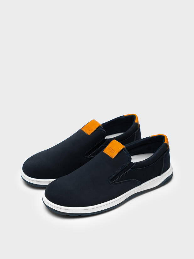 Эти стильные синие подростковые слипоны для мальчиков выполнены из натурального нубука — прочного и мягкого материала, который хорошо пропускает воздух и подходит для длительной носки. Благодаря боковым резинкам эту универсальную детскую обувь удобно снимать и надевать, а посадка получается плотной, но комфортной — без застёжек и шнурков.