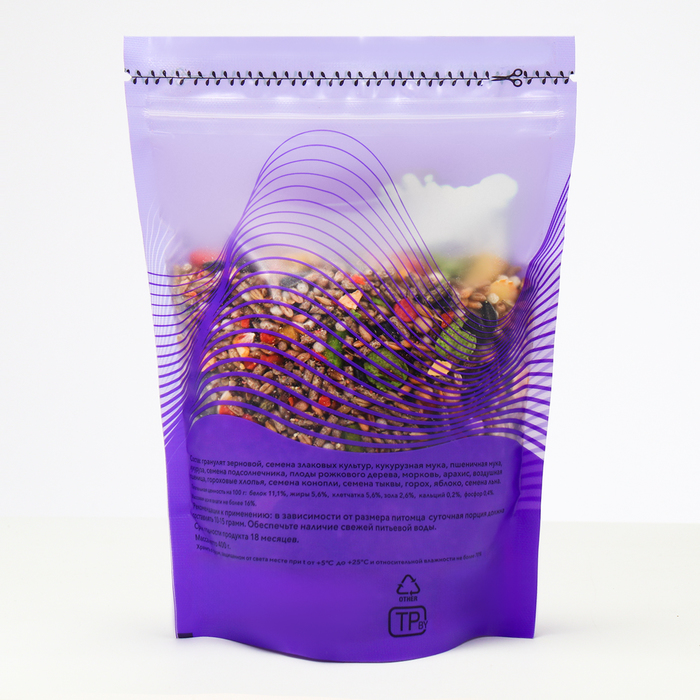 При сборе кормов мы используем цельные зерна семян, за счет чего в них сохраняются все необходимые витамины и микроэлементы. Пшеница является мощным стимулятором моторики кишечника; Ячмень содержит в своем составе уникальный набор важных для организма макро и микроэлементов; Арахис богат белками, полиненасыщенными жирами и полезными питательными веществами; Кукурузные хлопья богаты белками, минеральными солями, витаминами группы В, жирами и углеводами; В семенах подсолнечника большое количество жирной кислоты, которая оказывает позитивное воздействие на шерсть; Семена льна защищают желудочно-кишечный тракт, улучшают аппетит.