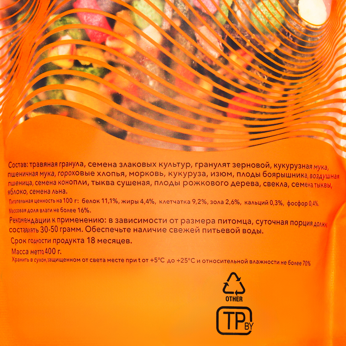Травяная гранула, семена злаковых культур, гранулят зерновой, кукурузная мука, пшеничная мука, гороховый хлопья, морковь, кукуруза, изюм, плоды боярышника3 воздушная пшеница, семена конопли, тыква сушеная, плоды рожкового дерева, свекла, семена тыквы, яблоко, семена льна.