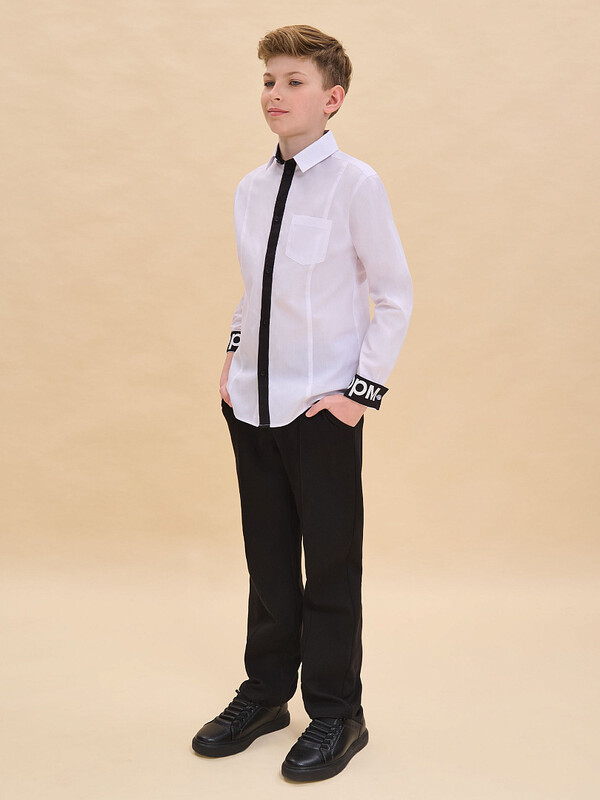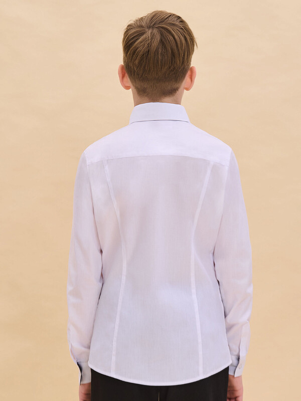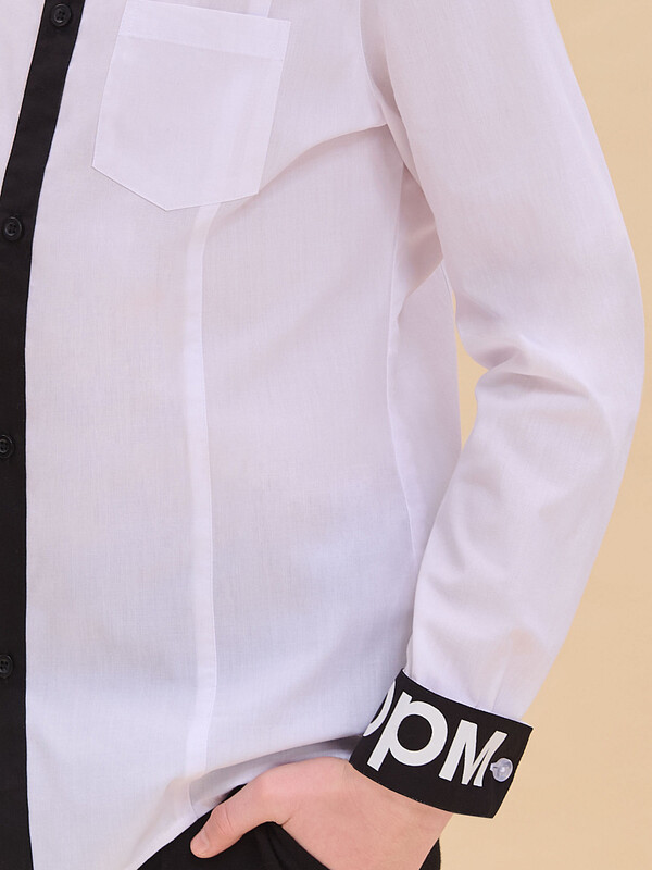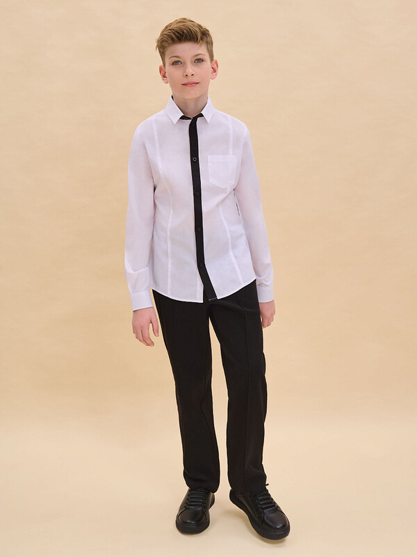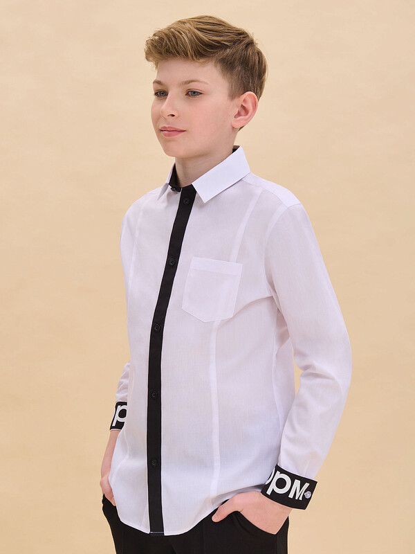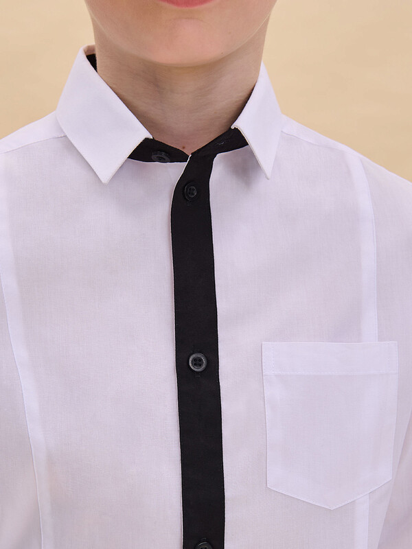Школьная рубашка для мальчика из практичной ткани с современными деталями. Самые уязвимые для грязи детали выполнены из ткани контрастного цвета. Это разбавляет официальный стиль и позволяет не стирать белую рубашку каждый день.