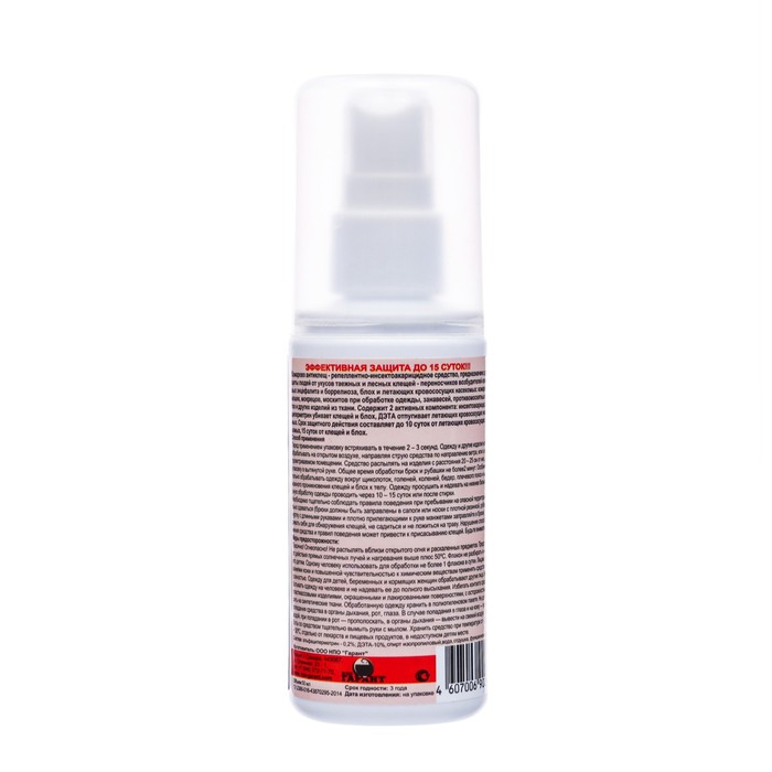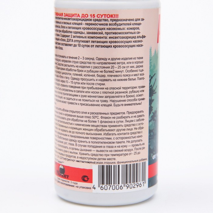 Назначение: Спрей против клещей.Характеристика: Предназначен для защиты от укусов таежных и лесных клещей и кровососущих насекомых: комаров, мошек, блох, мокрецов, москитов при нанесении на одежду. Срок защитного действия при нанесении на одежду и другие изделия из ткани составляет 10 суток против летающих кровососущих насекомых, 15 суток против клещей и блох. Основные особенности: предназначен для нанесения только на одежду и иные изделия из ткани; содержит в качестве Активного действующего вещества как репеллентный (отпугивающий) компонент – ДЭТА, так и инсектоакарицидный (убивающий насекомых и клещей) – высокоэффективное средство альфа-циперметрин; при правильном применении обеспечивает длительный защитный эффект; удобный объем флакона позволяет легко брать его с собой на лесные прогулки, дачу, рыбалку и т.д.Способ применения: Перед применением упаковку встряхнуть в течение 2-3 секунд. Нанести средство на одежду вокруг щиколоток, голеней, коленей, бедер, плечевого пояса и мест возможного проникновения клещей и на другие изделия из ткани.Меры предосторожности: Токсично! Огнеопасно! Не распылять вблизи открытого огня и раскаленных предметов. Предохранять от действияпрямых солнечных лучей и нагревания выше плюс 50С. Флакон не разбиратьи не давать его детям. Одному человеку использоватьдля обработки не более 1 флакона в сутки. Лицам с заболеваниями кожи и повышенной чувствительностью к химическим веществам применять средство с осторожностью. Одежду для детей, беременных и кормящих женщин обрабатывают другие лица. Не обрабатывать одежду на человеке и не надевать ее до полного высыхания. Избегать контакта средства с пластмассовыми изделиями, окрашенными и лакированными поверхностями, с осторожностью наносить на синтетические ткани. Не допускать попадания средства в органы дыхания, рот, глаза. В случае попаданияв глаза и на кожу - промыть их водой, при попадании в рот - прополоскать, в органы дыхания - вывести на свежий воздух. После работы со средством тщательно мыть руки с мылом . Хранить средство при температуре от -25 до +30С, отдельно от лекарств и пищевых продуктов, в недоступном детям месте.Действующее вещество: ДЭТА 10%, альфациперметрин 0,2%.