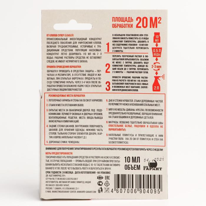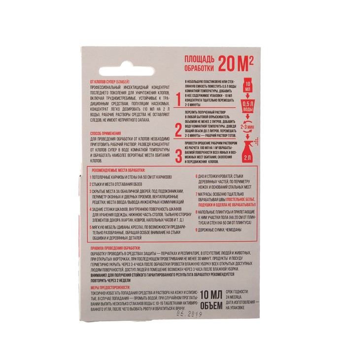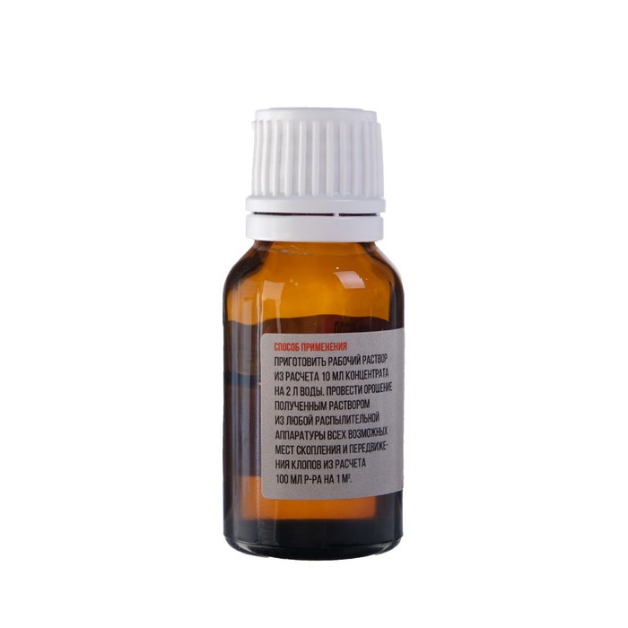 Назначение: для уничтожения клопов.Профессиональный концентрат уничтожает все виды клопов, включая трудноискоренимые популяции, устойчивые к традиционным средствам. Раствор данного продукта не оставляет следов, практически не имеет запаха и безопасен для теплокровных. Насекомые гибнут через 1 сутки.Действующее вещество: ацетамиприд (20 %).Способ применения: для проведения обработки от клопов необходимо подготовить рабочий раствор, раздедя концентрат от клопов в воде комнатной температуры и обработать наиболее вероятные места обитания клопов.