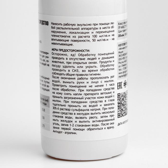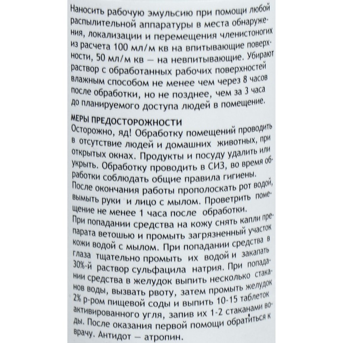 Способ применения: Для проведения обработки необходимо приготовить рабочую эмульсию путем разведения концентрата «Агран» водой комнатной температуры. Наносить рабочую эмульсию при помощи любой распылительной аппаратуры в места обнаружения, локализации и перемещения членистоногих из расчета 100 мл/м кв на впитывающие поверхности, 50 мл/м кв – на невпитывающие. Убирают средство с обработанных рабочих поверхностей влажным способом не менее чем через 8 часов после обработки, но не позднее, чем за 3 часа до планируемого доступа людей в помещение.