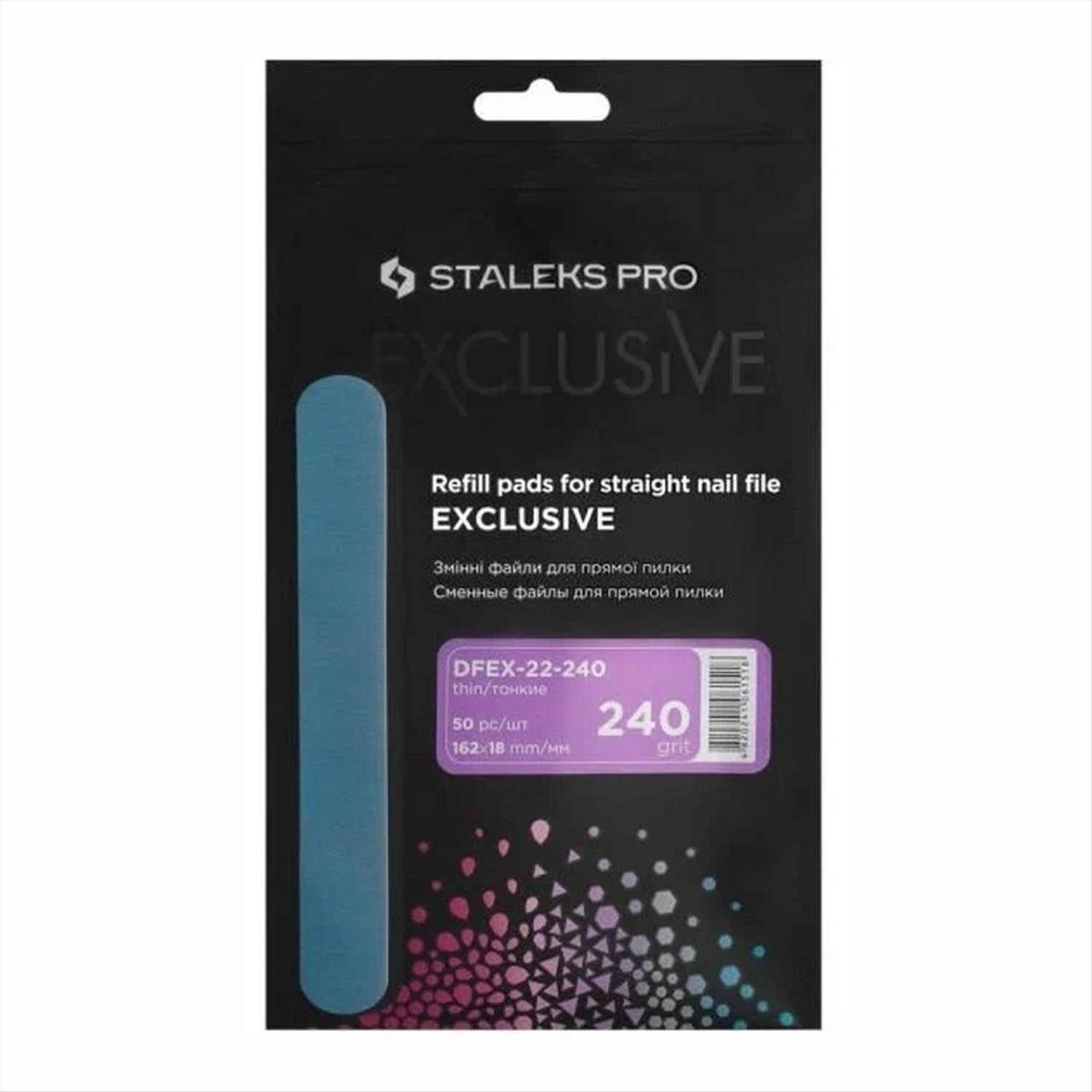 Производитель: Staleks (Сталекс); Габариты: 21,5 x 12,5 x 0,5 см; Штрих-код: 4820241061518; Бренд-код: DFEX-22-240; Страна изготовитель: Украина; Кол-во в упаковке: 50 шт./уп.; Материал: Абразивный минеральный материал; Размер: 162 x 18 мм; Страна: Украина