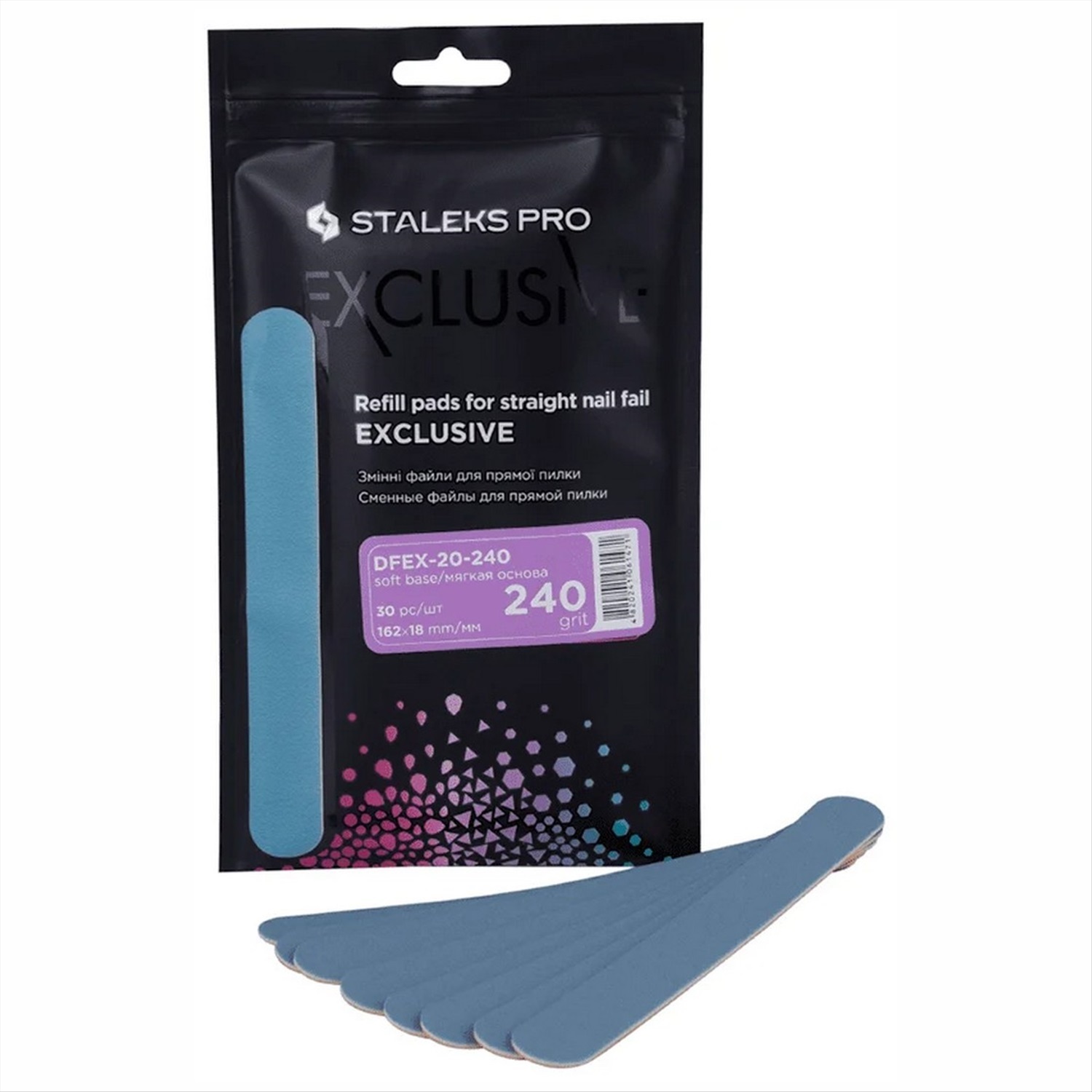 Использование одноразовых сменных файлов Staleks PRO Exclusive - безопасно. После каждого клиента наклейка заменяется новой, а основа — дезинфицируется и стерилизуется чтобы допустить распространения инфекции. Использовать сменные файлы удобно благодаря самоклеящейся основе - файлы моментально наклеиваются на металлическую пилку и не смещаются во время работы, не размокают в воде.