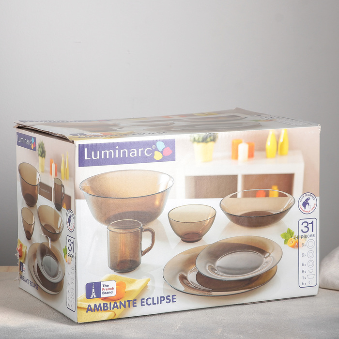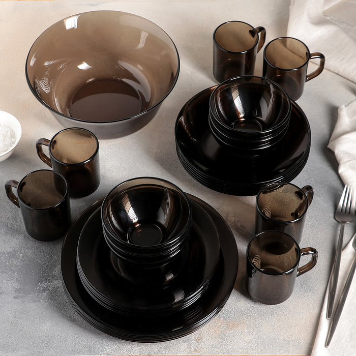 Габариты: 40 x 27 x 27 Страна: Россия В боксе: 1 набор Состав: Ударопрочное стекло Материалы: Ударопрочное стекло Фасовка: по 1 набор Индивидуальная упаковка: Цветная картонная коробка Сертификат: РСТ Набор: Да Цвет: Коричневый Количество персон: 6 В наборе, шт.: 31 Тематика: Однотонная Рисунок: Нет Материал: Закалённое стекло Вид тарелки: Глубокая, Плоская Можно мыть в посудомоечной машине: Да Можно использовать в СВЧ-печи: Да Текстура: Гладкая Особенности: Без особенностей Для горячего: Да Этот сервиз из 31 предмета из прочного стекла — отличное решение для вашей кухни. Красивый коричневый цвет и стильный дизайн прекрасно впишутся в любой интерьер, а прочность стекла обеспечит долговечность вашего сервиза. Преимущества:
