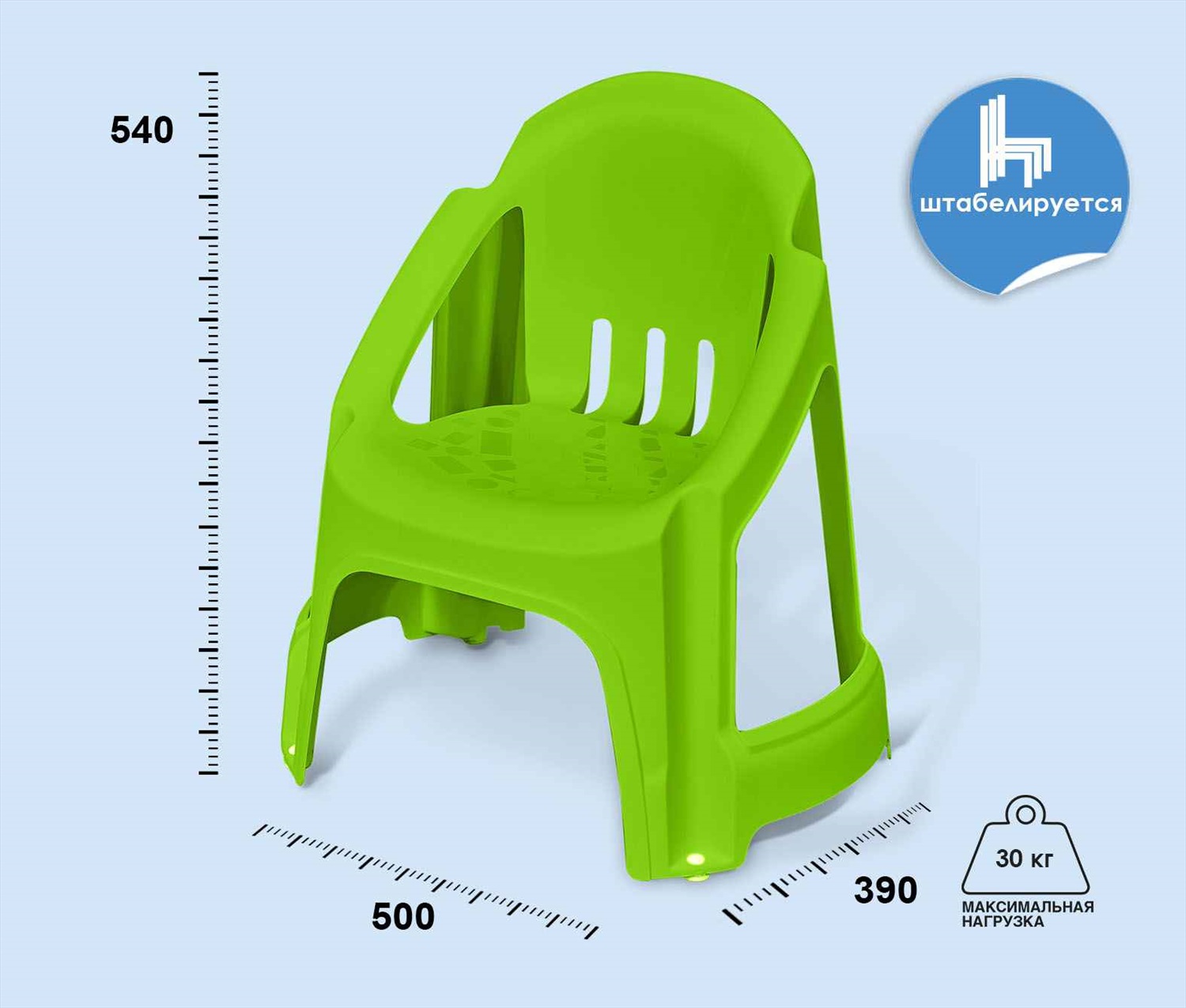 Цвет: зеленый; Материал: пластик; Размер изделия, мм: 500x390x540; Вес изделия, кг: 0.900; Штабелируемые: Да; Поворотный: нет; Материал сидения и спинки: пластик; Материал каркаса: пластик; Максимальная нагрузка, кг: 30; Складной: нет; Спинка: Со спинкой; Подлокотники: да; Регулировка высоты: нет; На колесиках: нет; Тип сидения: жесткое; Тип спинки: жесткое; Штабелируемый: да