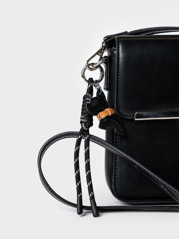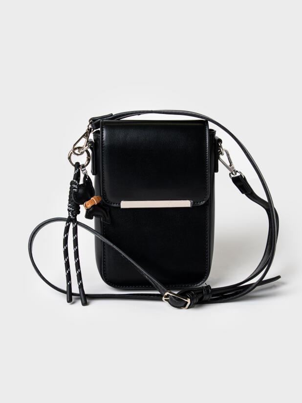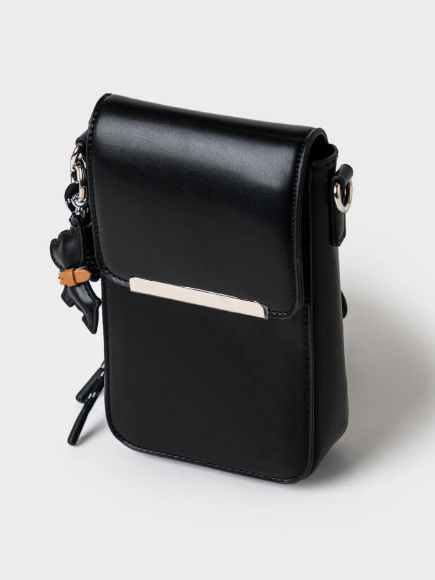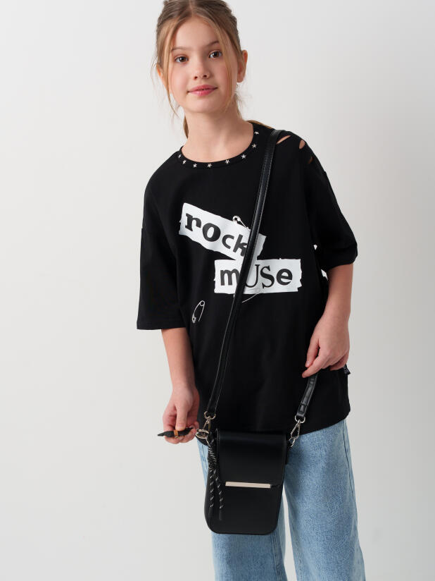 Небольшая, жесткой формы, сумка кросс-боди для телефона для девочки-подростка. Материал - искусственная кожа. Дополнительно сумка декорирована брелоком. Регулируемый плечевой ремень. Конструкция сумки с кламаном на магните. Сзади имеется карман для транспортной карты. Параметры сумки: высота - 19 см, ширина -13 см, глубина - 3,5 см. В подарок идет дополнительный фирменный мешок для сумки (пыльник).