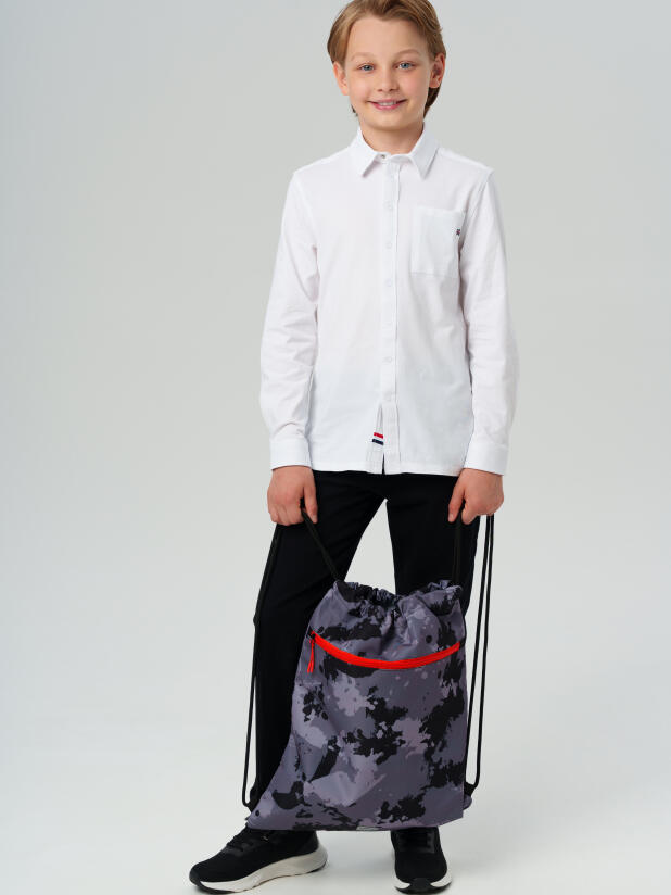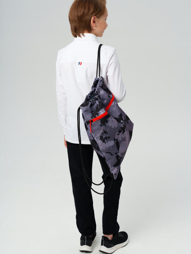 Сумка-мешок для сменной обуви из прочной водонепроницаемой ткани для мальчика подростка. Мешок для сменки для школьника с вместительным отделением, затягивающимся двумя шнурками. Дополнительный внешний карман застегивается на молнию. Размер мешка 39*48 см. Это отличный вариант для школы и детского садика. В него можно складывать не только сменную обувь, но и спортивную одежду для физкультуры и секций, брать в путешествия. Он легкий и компактный. К мешку для сменки можно подобрать рюкзак и пенал в едином дизайне.