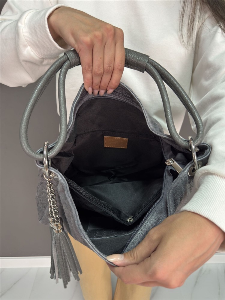 Шикарная выделка кожи, замшевая с тиснением под крокодила, мягкая лаконичная форма и оригинальные крупные кольца фурнитуры в серебряном цвете и изысканная кисть на молнии придают сумочке дорогой и респектабельный вид.
