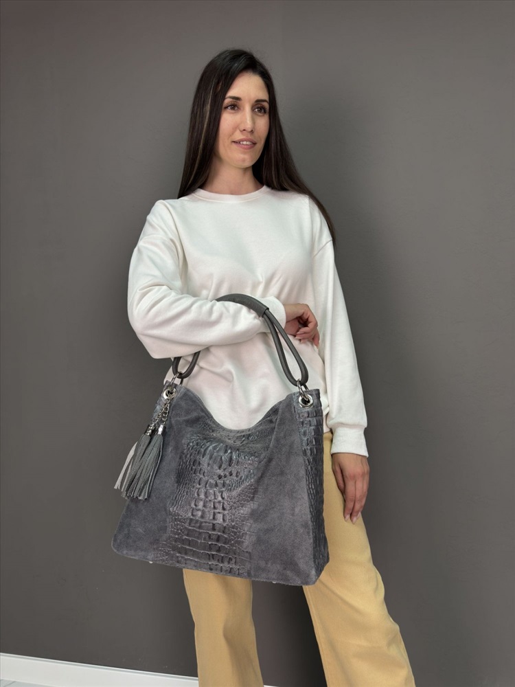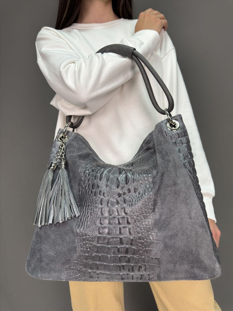 Страна: Италия; Тип товара: Сумки; Тип кожи: Телячья; Тип: Женские; Производитель: Pelletteria Luisa, Italy; Размер: большая; Стиль ношения: длинные ручки на плече; Форма: мягкая; Выделка кожи: замшевая под крокодила; Цвет кожи: Серый; Оттенок: темно-серый; Упаковка: Пакет тканевый L, 40x40 см; Палитра цветов: TB-105728 Caimano; На складе: есть