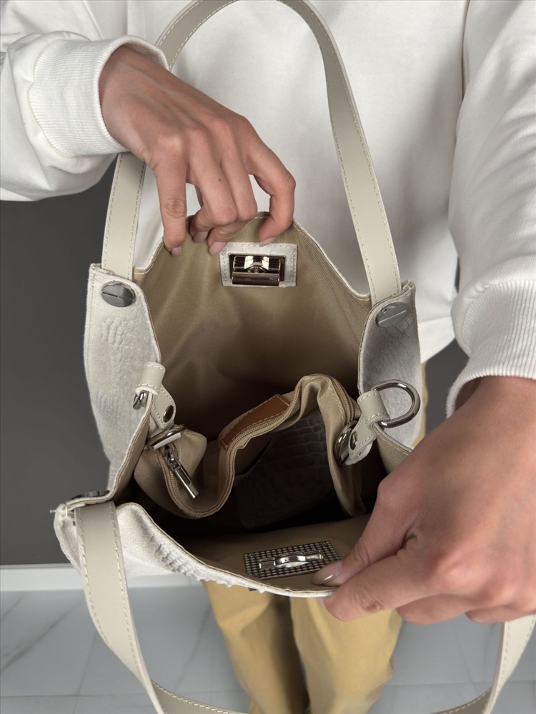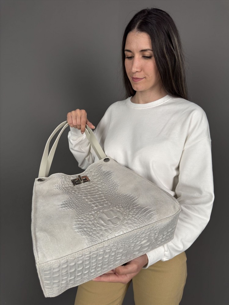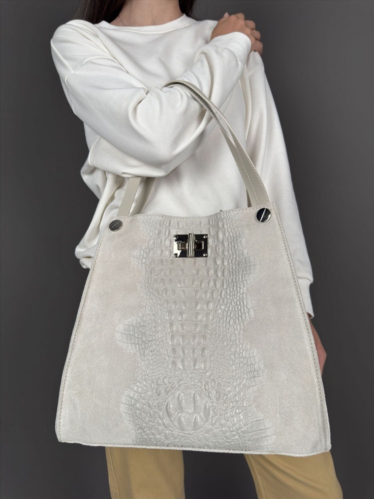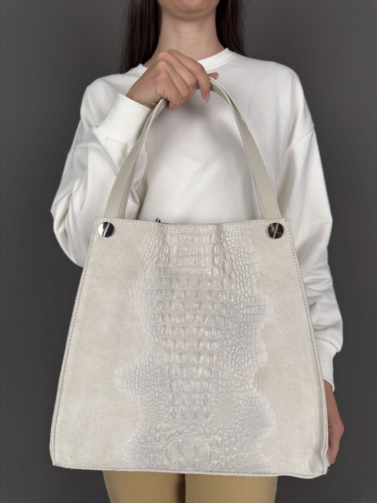 Сумочка имеет мягкую форму шоппера, дно укреплено, выполнена из телячьей кожи замшевой выделки с изысканным тиснением под крокодила. В качестве элегантного украшения – большая металлическая пряжка и заклепки. Модель универсальна, сочетается с вещами в стиле Casual, будет органично смотреться в классическом, деловом, винтажном, либо повседневном образах.