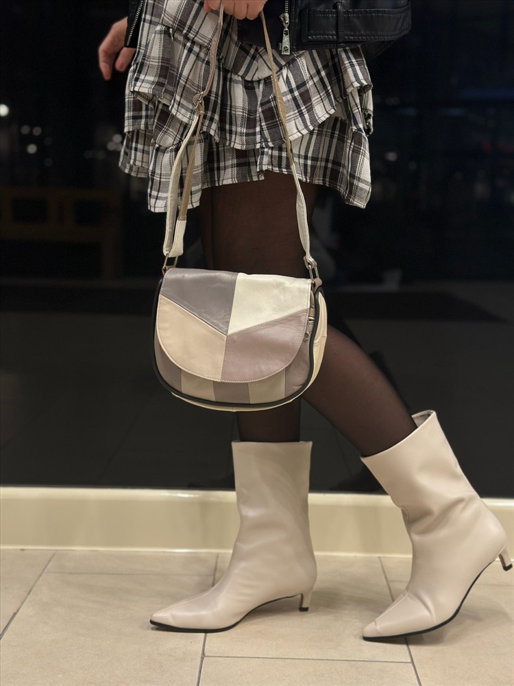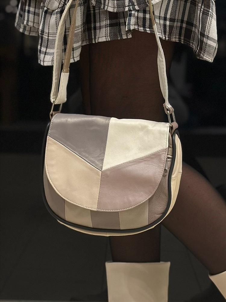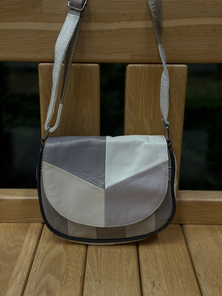 Небольшая аккуратная сумка кросс-боди из натуральной кожи, производства Турция. Выполнена в стиле «Пэчворк» - из кусочков разного цвета, тональность бежевые цвета. Цвета не имеют строгого соответствия в каждой конкретной сумке, каждый рисунок индивидуален. Мягкая прочная кожа, очень легкая. Закрывается на молнию сверху, дополнительно на клапан с магнитной застежкой. Внутри: 1 отделение, на боковой стенке 1 карман на молнии. На лицевой стороне снаружи карман на молнии. На задней стенке снаружи – большой карман на молнии. Плечевой ремешок – 100 см, регулируется по длине.