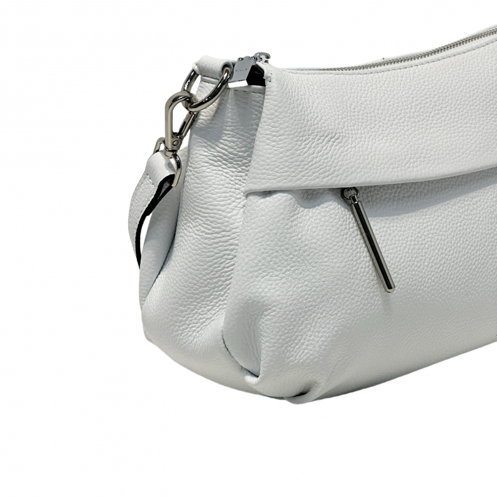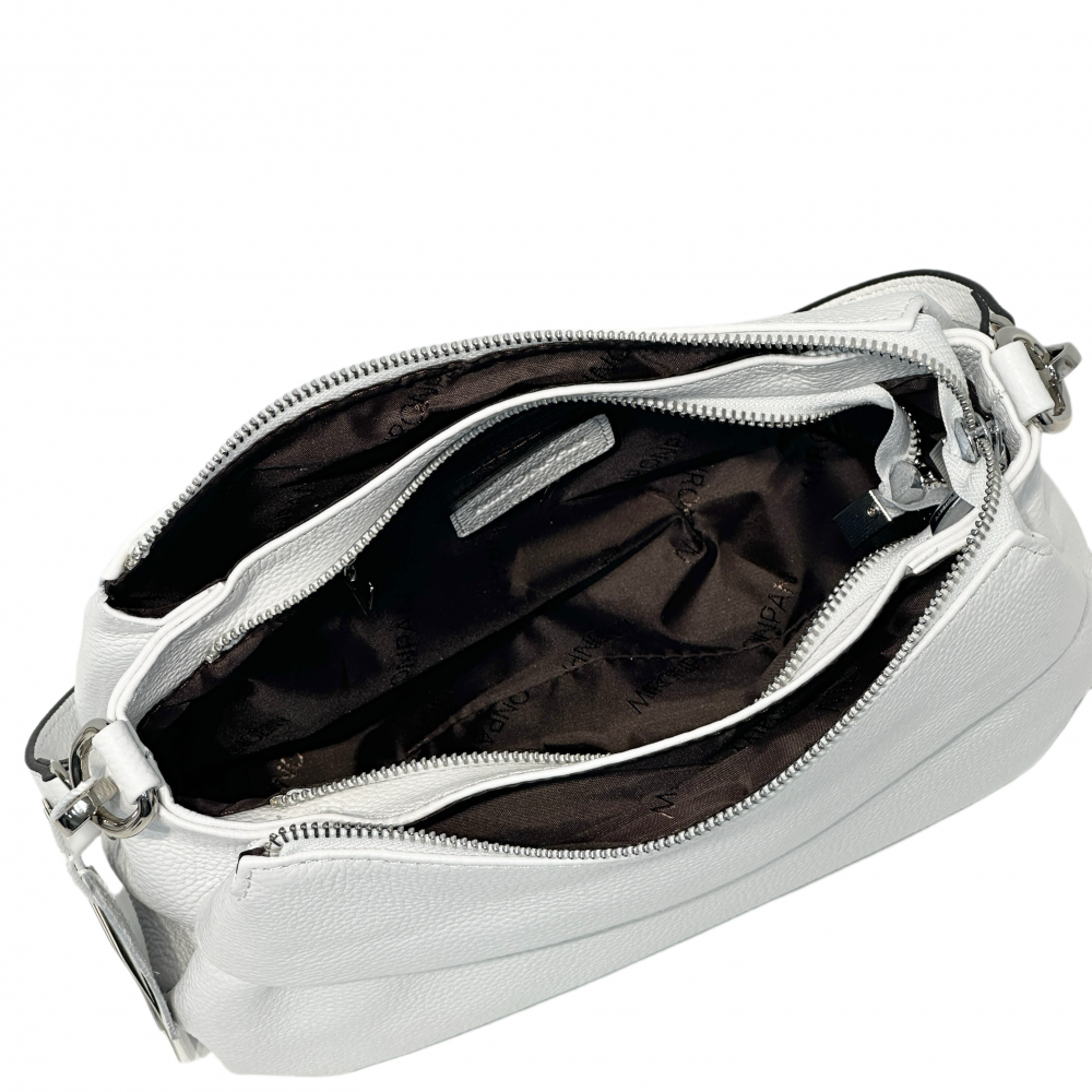 Вместительная кросс-боди MIRONPAN выполнена из натуральной зернистой кожи в белом оттенке. Основное отделение закрывается на молнию с металлическим поводком. Внутри три отделения средние закрывается на молнию . На лицевой и тыльной стороне есть карман быстрого доступа на молнии. В комплекте два плечевых ремня шириной 2 см , один регулируется по длине.
