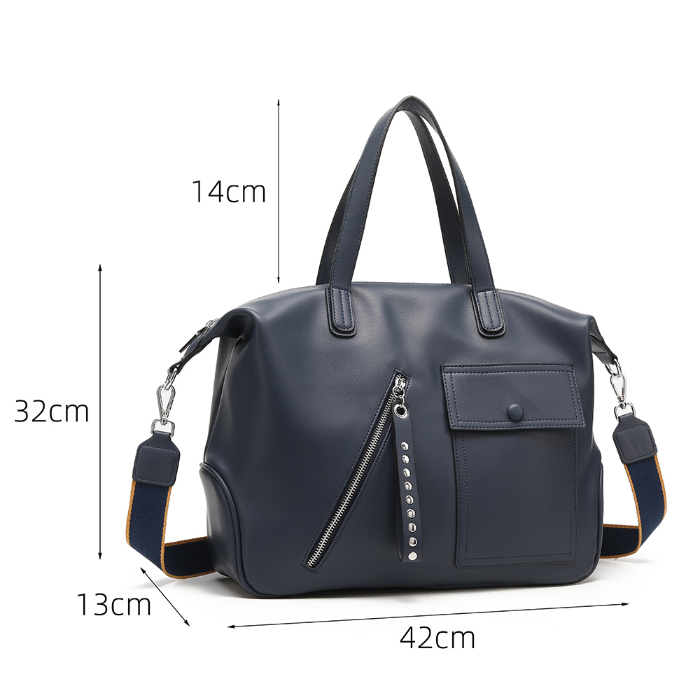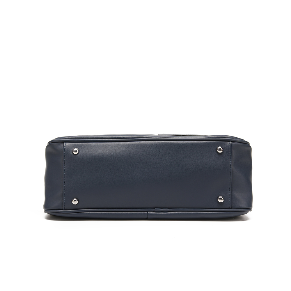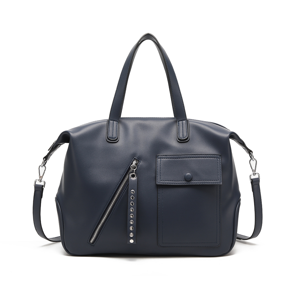 Вместительная сумка-тоут Saint Miranda в темно-синим цвете . Модель выполнена из экокожи гладкой текстуры. В качестве декора на лицевой стороне два оригинальных кармана быстрого доступа. С тыльной стороны есть карман быстрого доступа закрывается на молнию. Основное отделение закрывается на молнию с двумя металлическими поводками. Внутри есть перегородка на молнии между двумя отделениями есть 2 боковых кармана для мелочей: открытый и на молнии. Удобные ручки позволяют комфортно носить изделие в руке. В комплекте идут два съемных плечевых ремня (ширина - 2 см,4 см). Цвет фурнитуры - серебро. Вмещает формат А4.