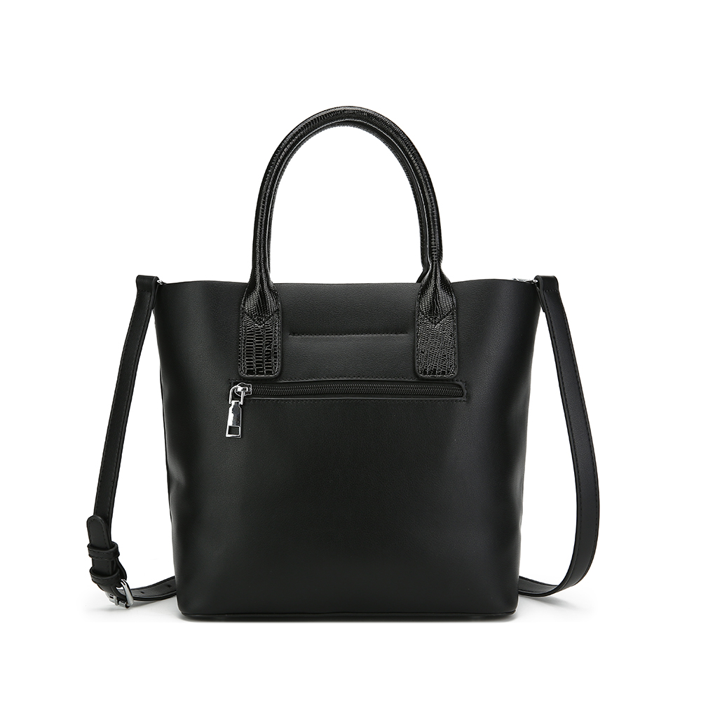Вместительная сумка-тоут Saint Miranda в черном цвете . Модель выполнена из экокожи гладкой текстуры. На лицевой стороне декорирован карман эффектной вставкой с тиснением под рептилию. С тыльной стороны есть карман быстрого доступа закрывается на молнию. Основное отделение закрывается на молнию с металлическим поводком. Внутри просторного отделения есть 3 боковых кармана для мелочей: открытых и два на молнии. Удобные ручки с тиснением под рептилию ,позволяют комфортно носить изделие в руке. В комплекте идёт съемный плечевой ремень (ширина - 2 см). Цвет фурнитуры - серебро. Не вмещает формат А4.