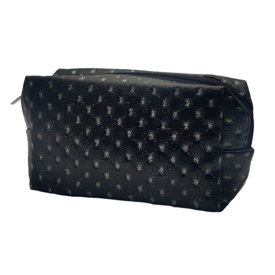 Бьюти-кейс выполнен в стильном черном цвете с вкраплениями серебристых блесток. Его тисненая поверхность придаёт незаменимому женскому аксессуару особый шарм.